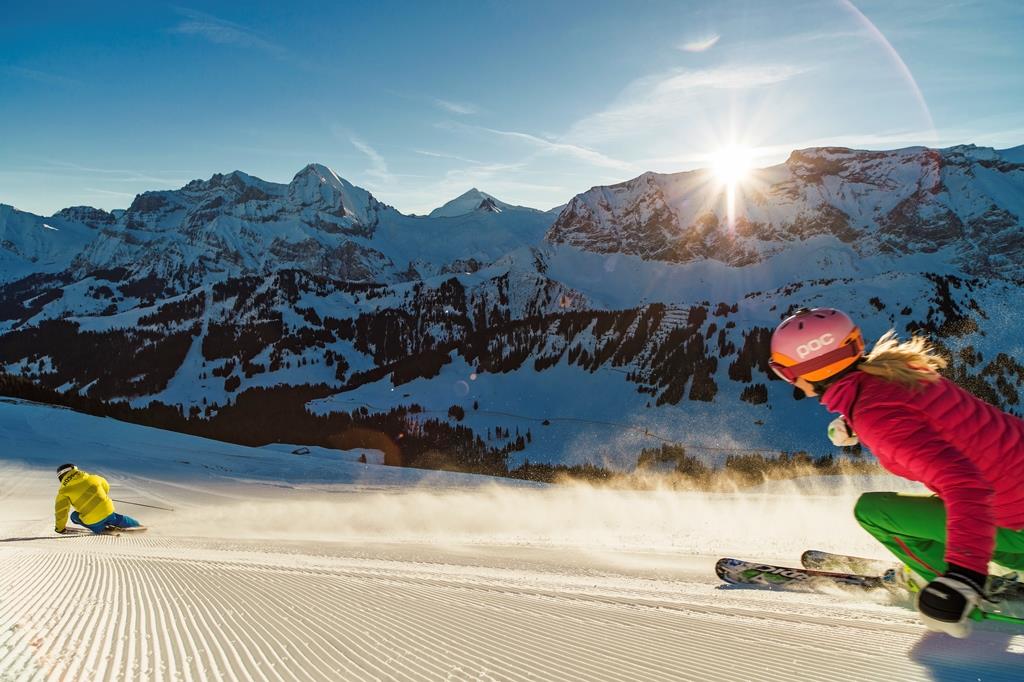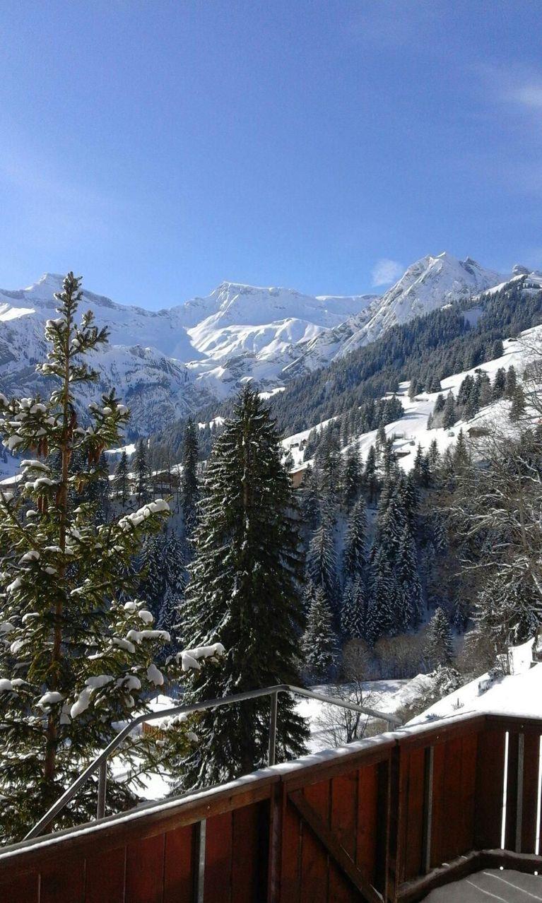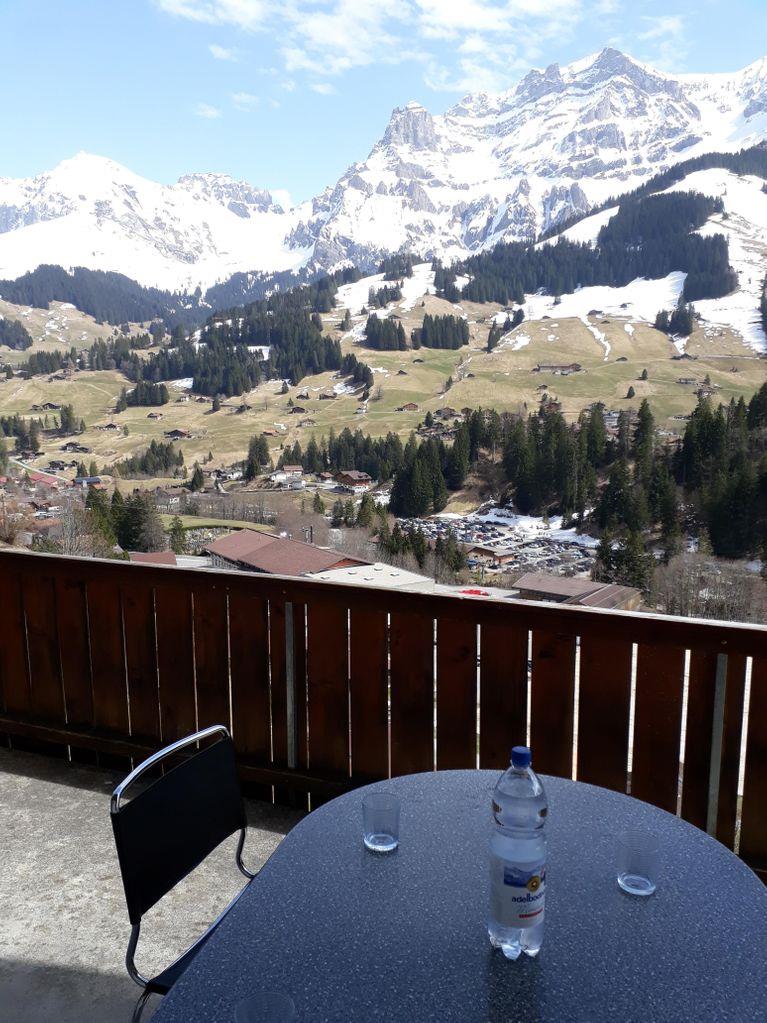 Grosser Balkon mit Bergpanorama Sicht auf Bunder, Engstligen und Chuenisbergli, Gartenmöbel und Elektrogrill.