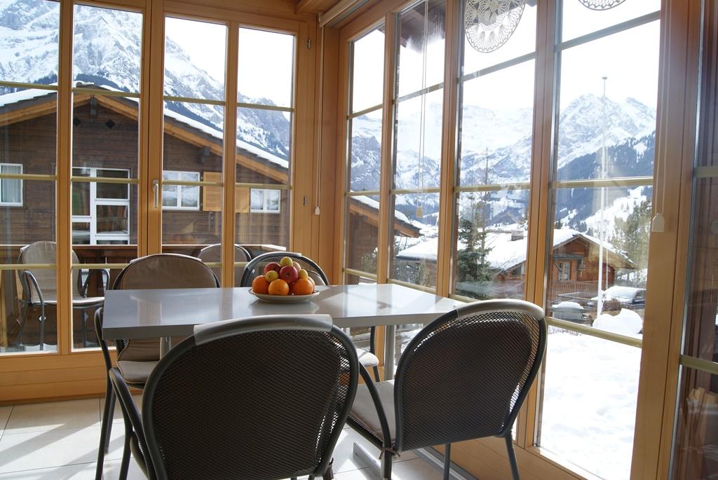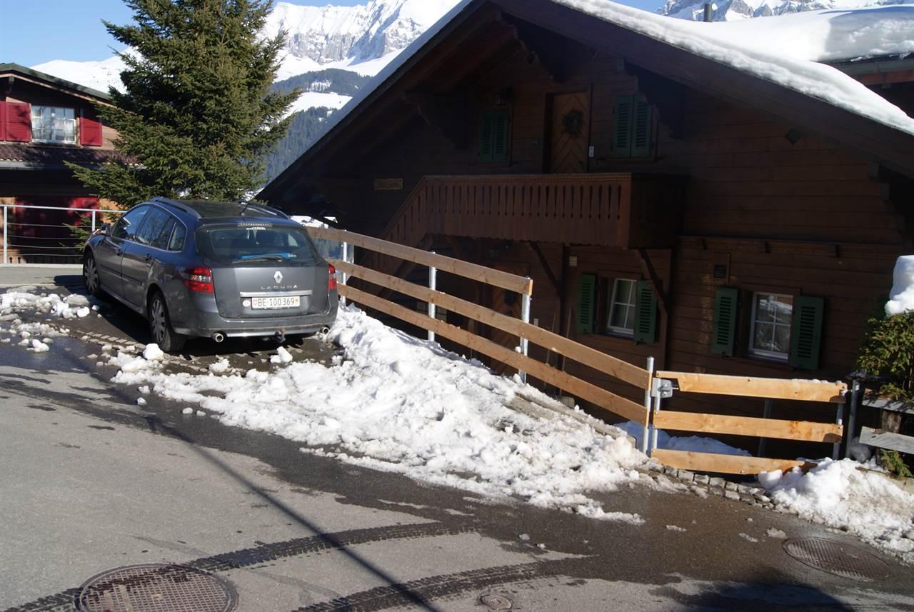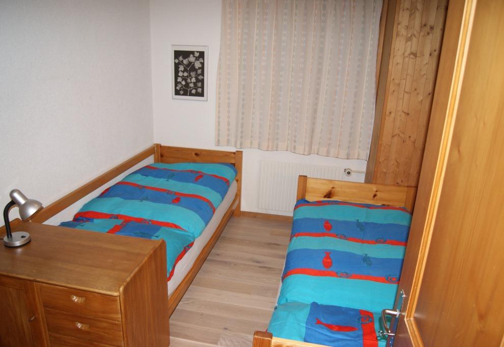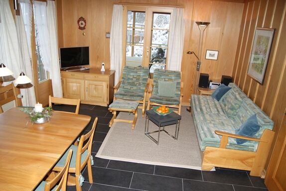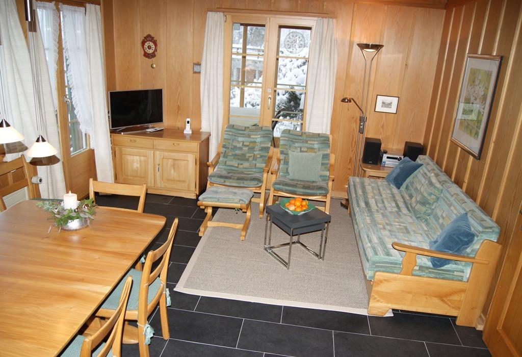 4-Zimmerwohnung (72m2) im Hochparterre, Chalet mit 3 Wohnungen, nahe dem Zentrum gelegen, absolut ruhig. 1 Schafzimmer mit Doppelbett, 1 Schlafzimmer mit 2 Einzel-Betten und 1 Schlafzimmer mit Etagenbett; auf Wunsch ist ein Kinderbett vorhanden. 1 Nassraum mit Dusche, WC und Waschmaschine, 1 Nassraum mit WC. Gut eingerichtete Küche mit Backofen, Mikrowelle, Kühlschrank, Geschirrspüler, Raclette- und Fondue-Ausrüstung, Kaffeemaschine etc. Wohn-Esszimmer mit Kabel-TV, Internet, Gratis-WLAN. Verglaste Laube (Wintergarten), Balkon und Liegeterrasse mit Gartenmöbeln. Eigener Parkplatz. Mitbenützung Garten, Ski- oder Veloraum. Haustiere sind nicht erlaubt.
