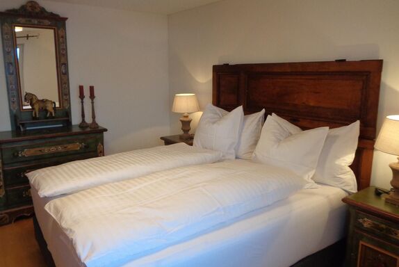 Im Engel-Schlafzimmer schlafen sie wie Engel auf Wolken im neuen Boxspringbett. Ein zusätzliches Waschbecken entlastet das Badezimmer. Im rustikalen Schlafzimmer mit Ausblick auf die Bergwelt, bieten neue Qualitätsmatratzen mit verschiedener Härte individuellen Schlafkomfort.