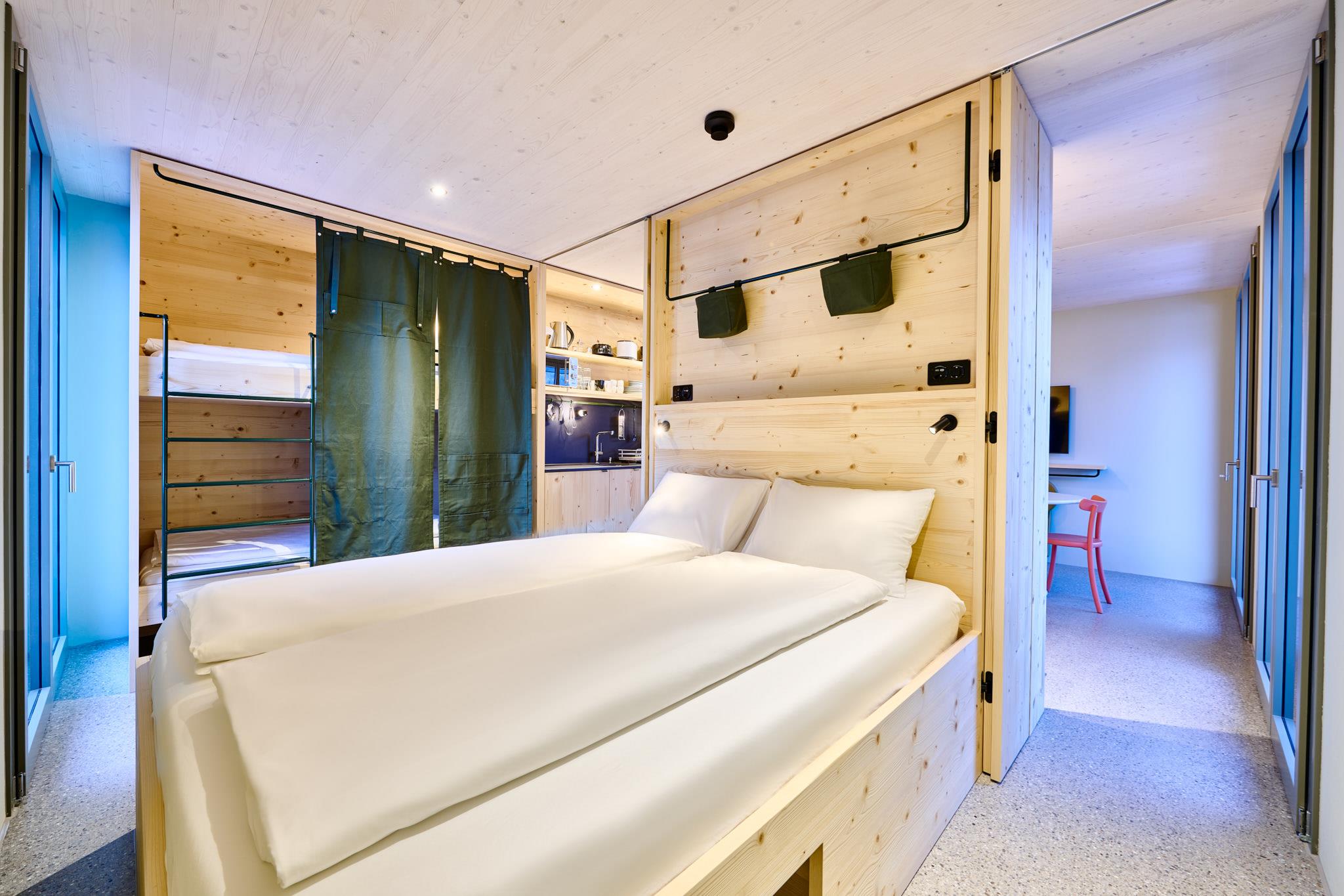 Freue dich auf ein «Mountain Loft Apartment» für bis zu 6 Personen mit voll ausgestatteter Küche inklusive Abwaschmaschine, Mikrowelle, Backofen, Kaffeemaschine, Fondue- und Chinoise-Caquelon sowie Raclette-Ofen. Auf dich wartet ein abtrennbares Schlafzimmer mit komfortablem Doppelbett sowie einem Etagenbett. Der gemütliche Wohnbereich mit Esstisch umfasst ein Smartroom-TV mit Streaming-Möglichkeit für alle Mobilgeräte und eine Chill-Ecke, welche mit wenigen Handgriffen zu einem weiteren hochwertigen Doppelbett umfunktioniert werden kann. Zusätzlich profitierst Du von einer Dusche mit separatem WC, einem kleinen Balkon und kostenlosem highspeed W-LAN für mehrere Endgeräte.