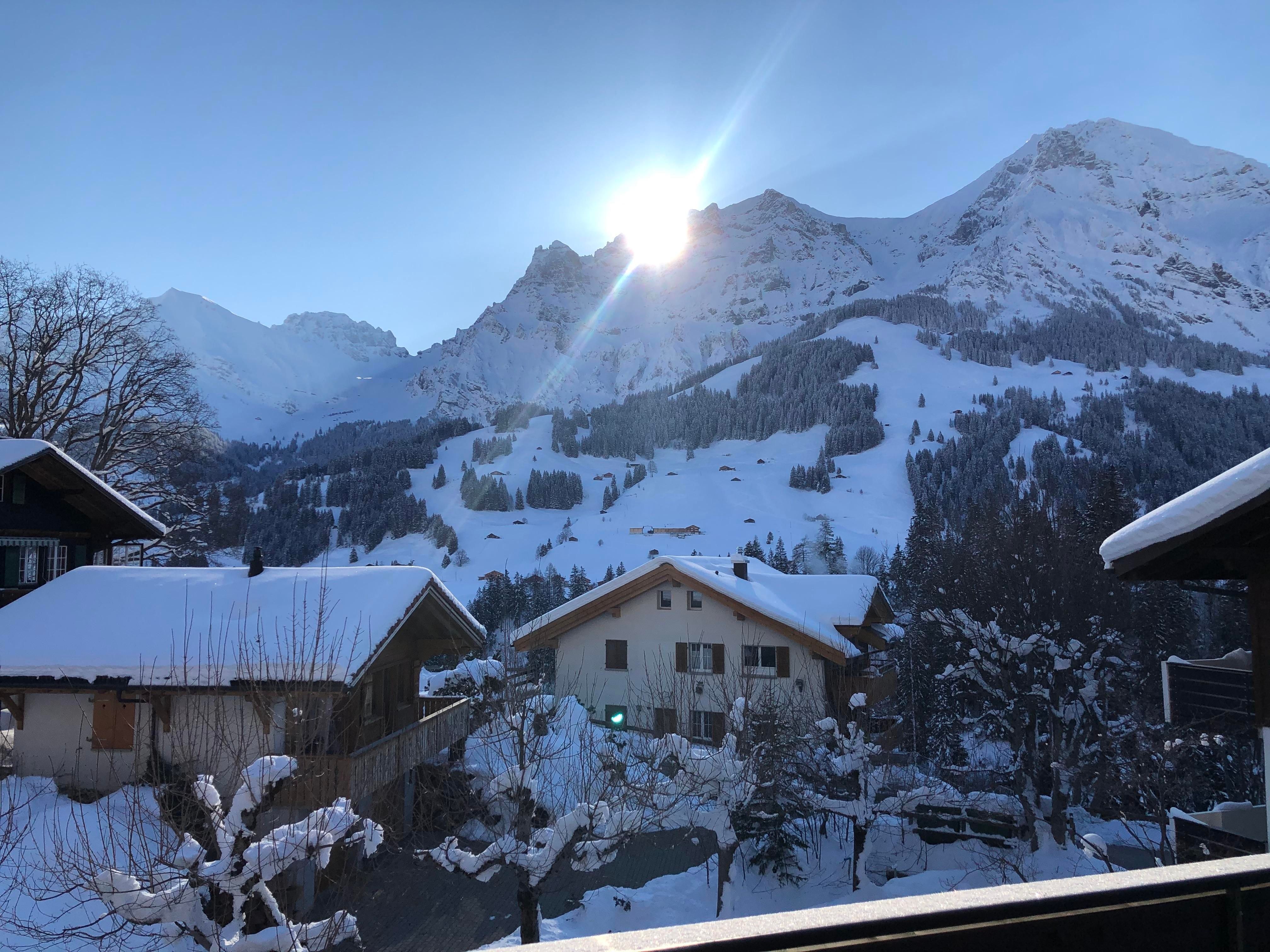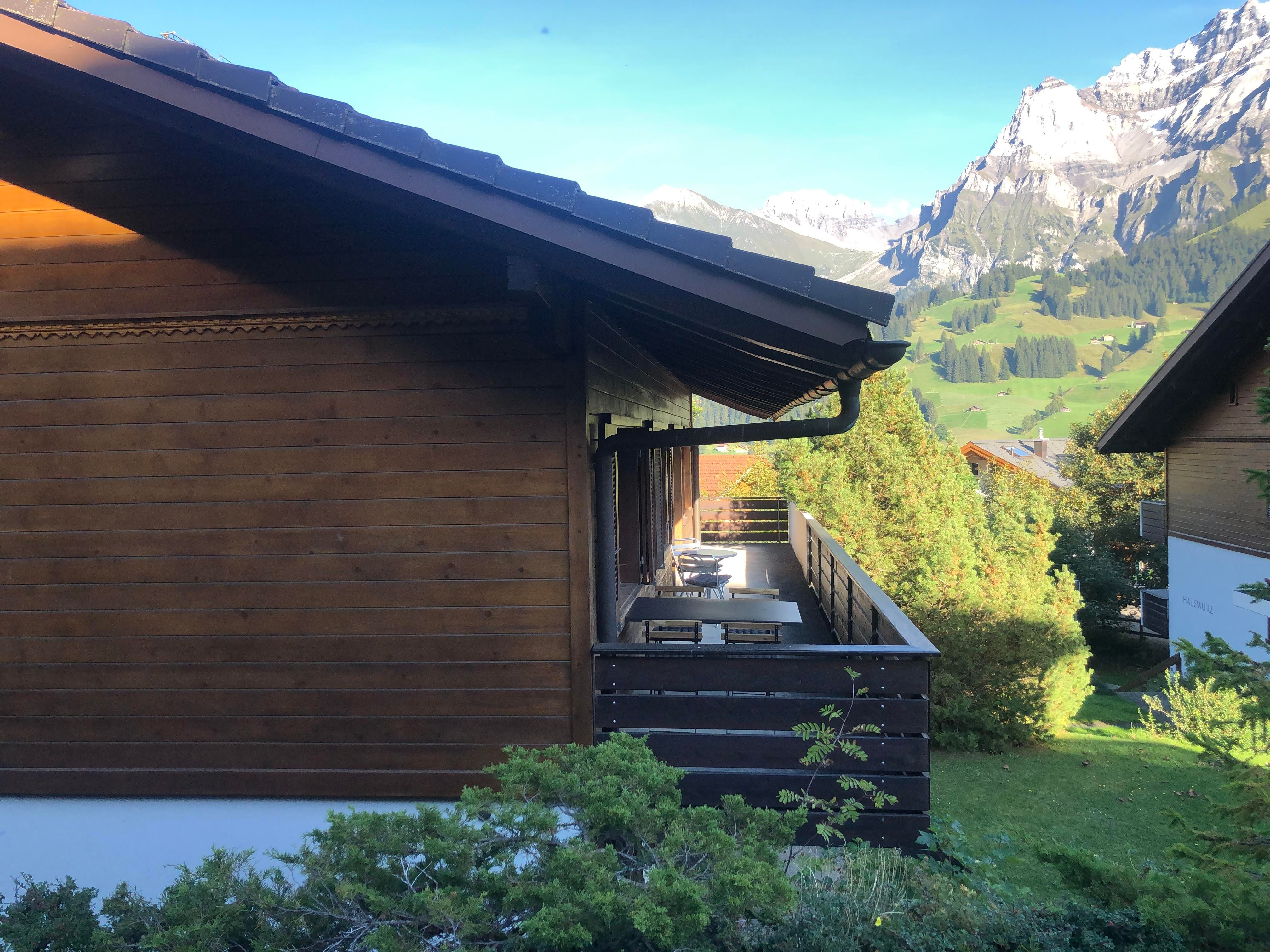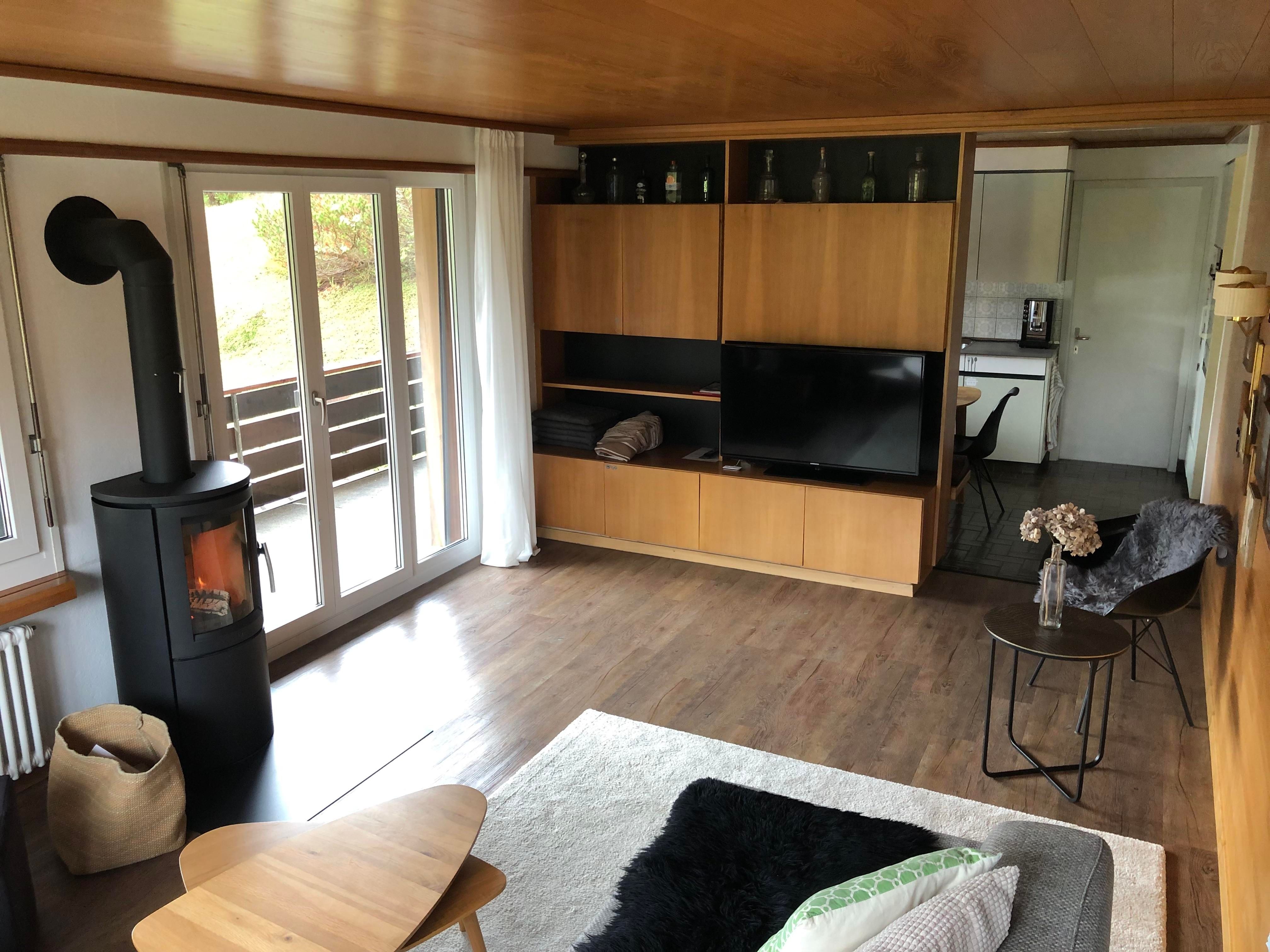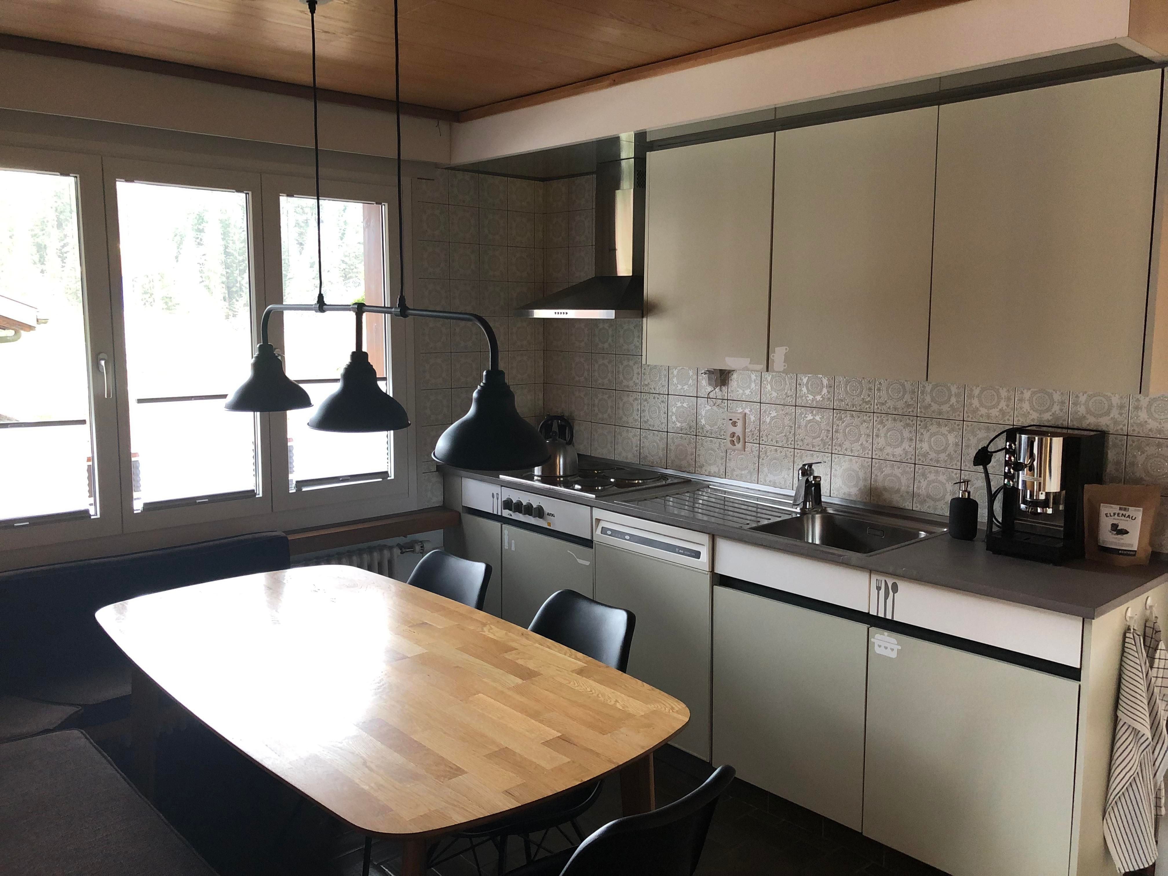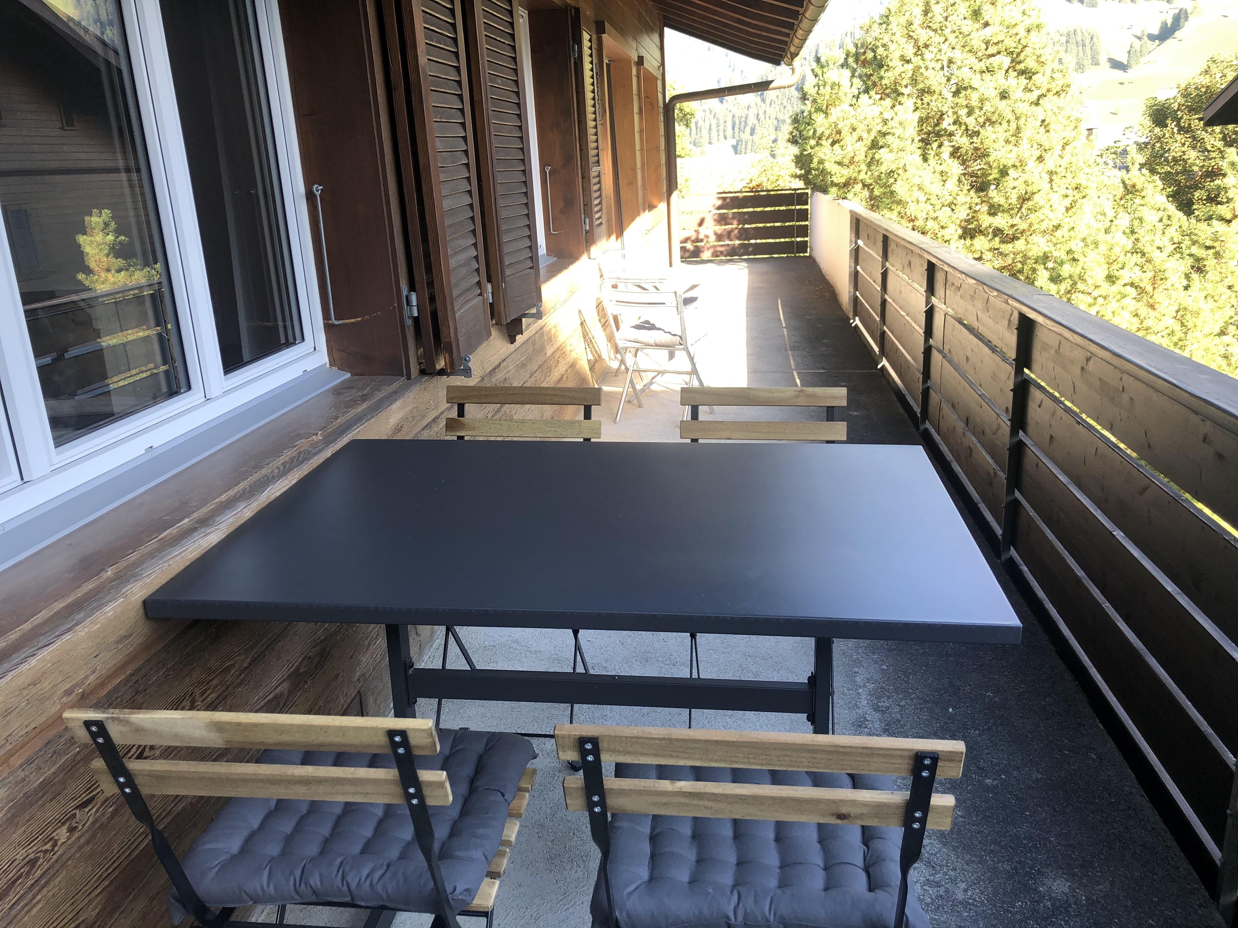 Das Holz steht zur Verfügung. Der grosse, über zwei Hausfronten ausgerichtete Balkon gehört zur Wohnung und bietet Sonne vom Morgen bis am Abend und einen herrlichen Blick auf die Berge von Adelboden und die Skiweltcuppiste Chuenisbärgli. Die Küche ist ausgestattet mit einem Esstisch, drei Kochherdplatten, Dampfabzug, Backofen/Steamer, Abwaschmaschine, Kaffeemaschine (mit Pads), Fondue- und Racletteset usw. Das Badezimmer hat eine Badewanne mit Duschvorrichtung, ein Waschbecken und ein WC.