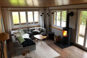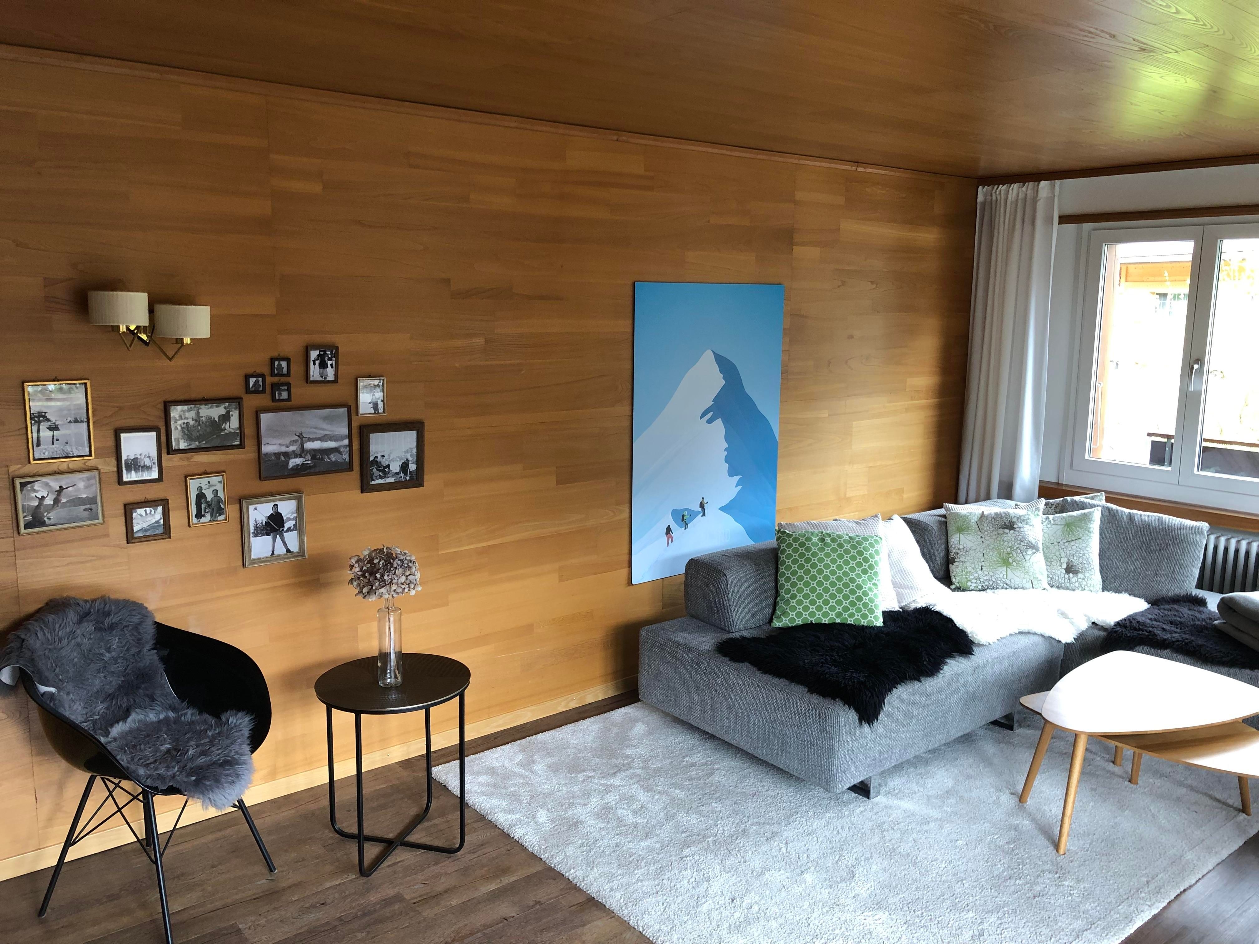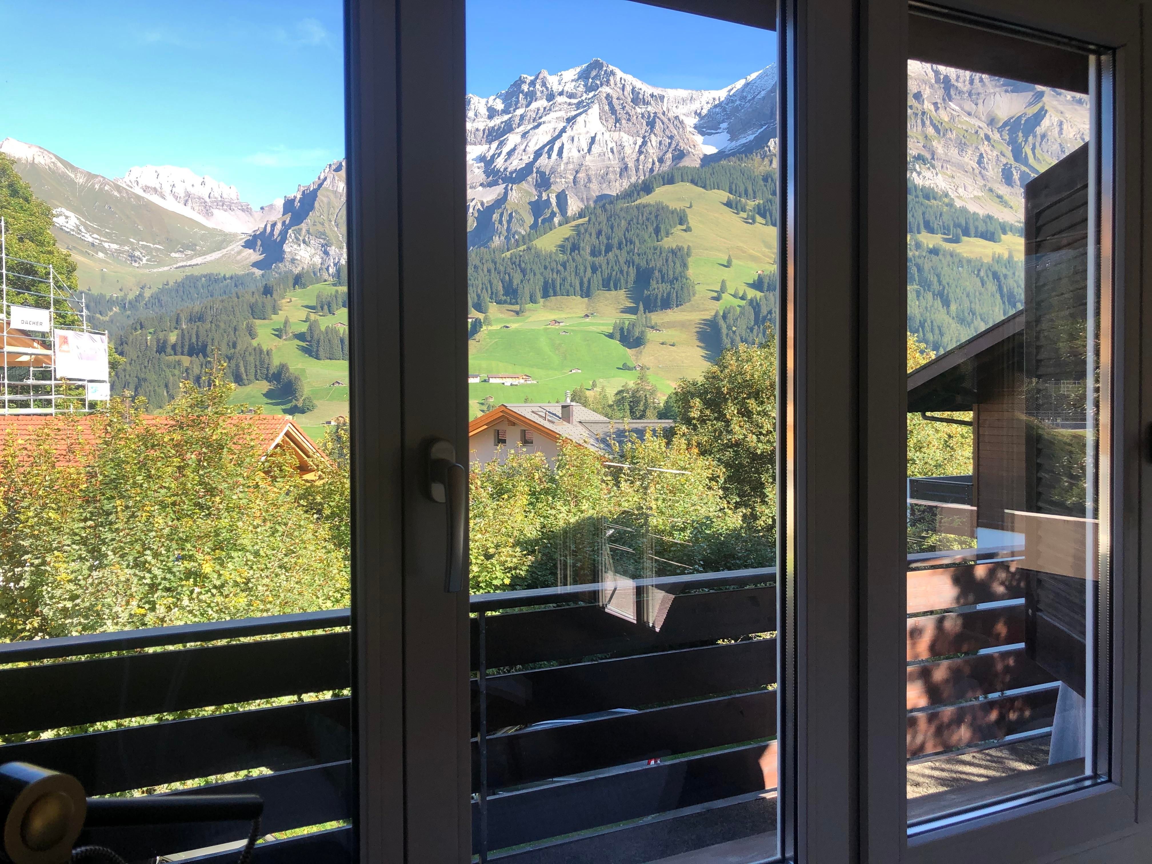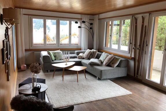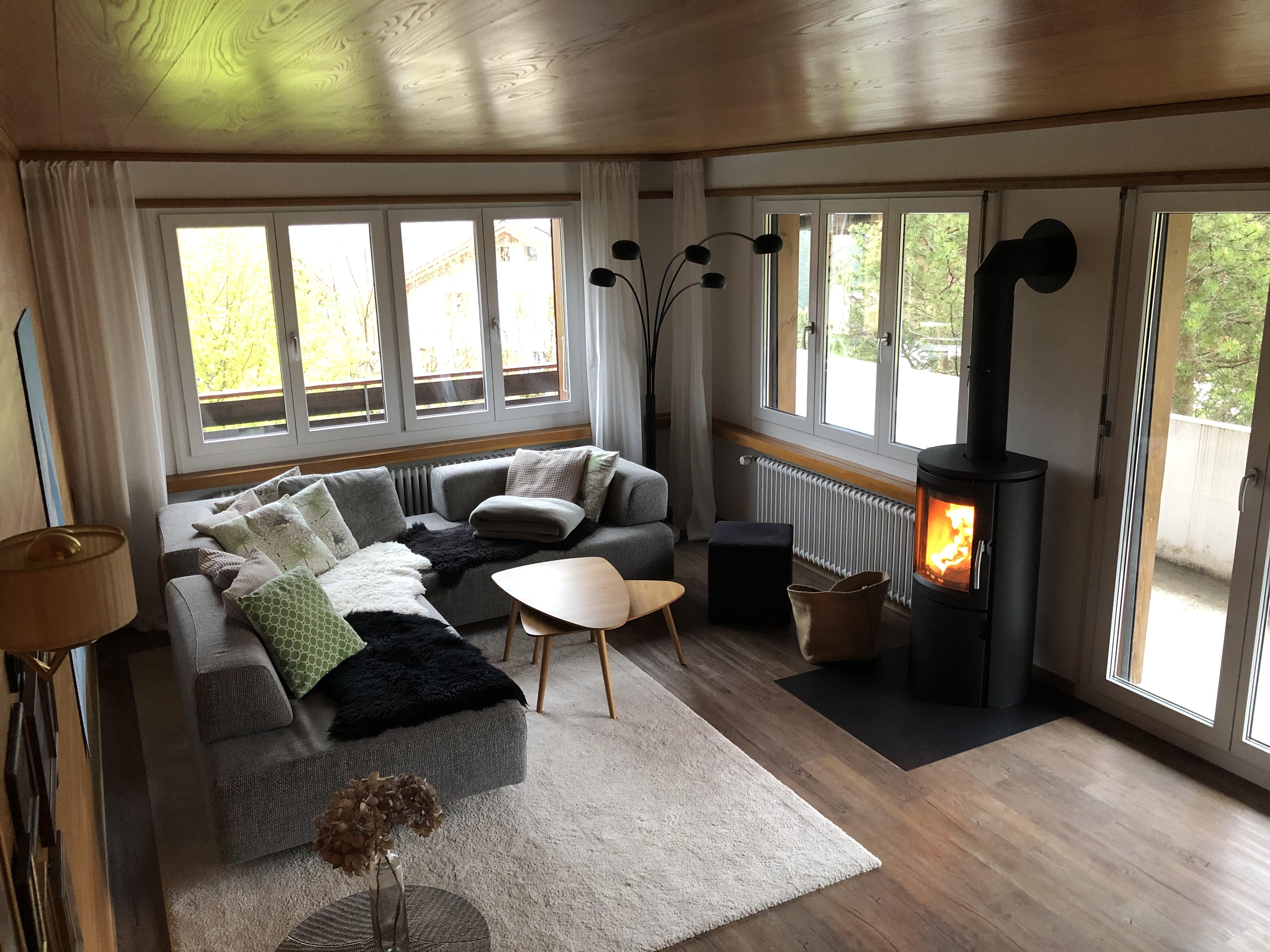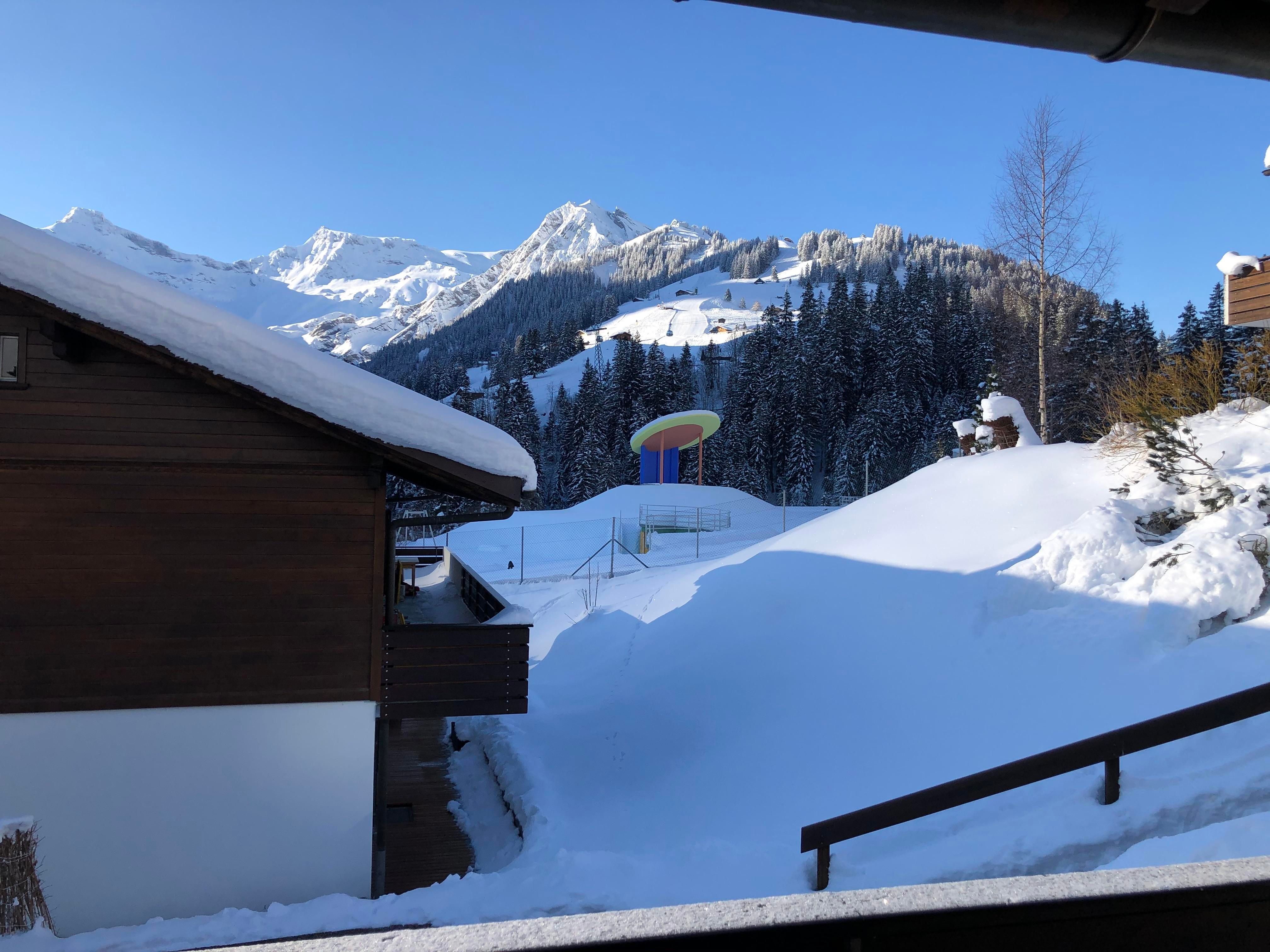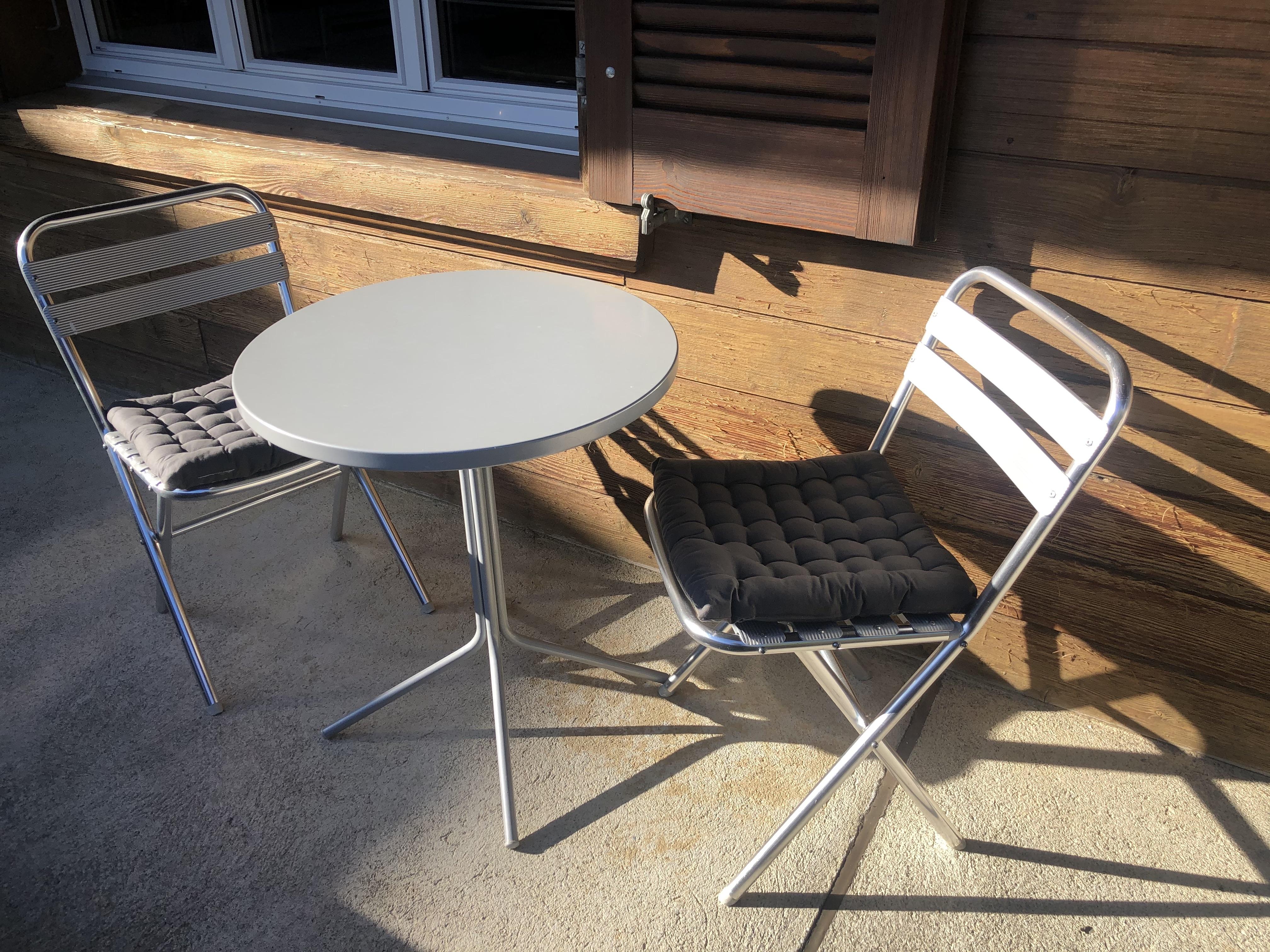 Das Holz steht zur Verfügung. Der grosse, über zwei Hausfronten ausgerichtete Balkon gehört zur Wohnung und bietet Sonne vom Morgen bis am Abend und einen herrlichen Blick auf die Berge von Adelboden und die Skiweltcuppiste Chuenisbärgli. Die Küche ist ausgestattet mit einem Esstisch, drei Kochherdplatten, Dampfabzug, Backofen/Steamer, Abwaschmaschine, Kaffeemaschine (mit Pads), Fondue- und Racletteset usw. Das Badezimmer hat eine Badewanne mit Duschvorrichtung, ein Waschbecken und ein WC.