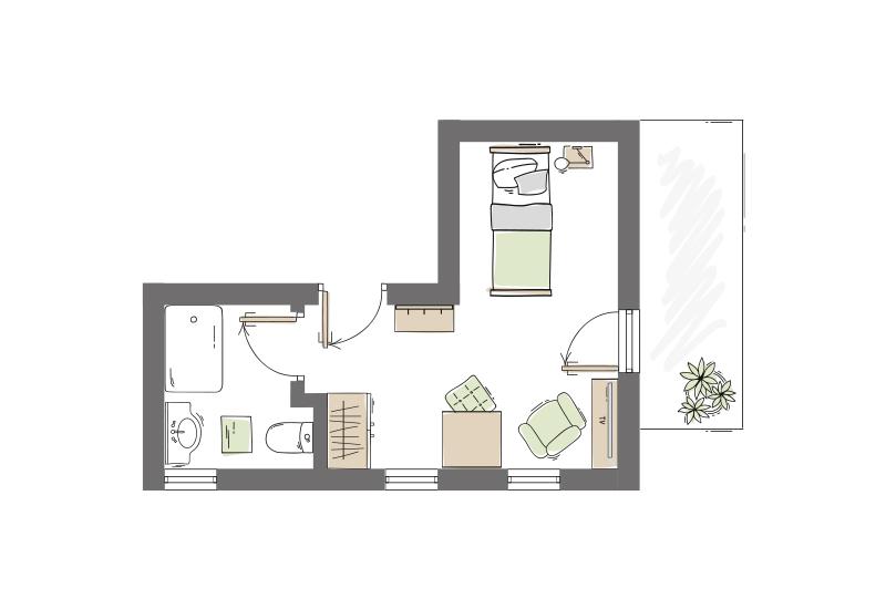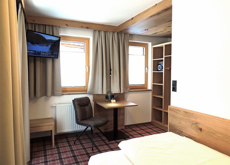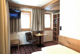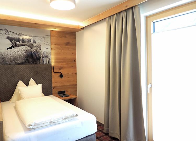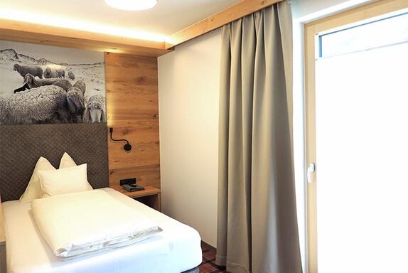 Einzelzimmer Nederkogel ca. 14m²: mit Boxspringbett, kleiner Sitzecke, Kabel-TV, Safe und Terrasse, Tageslichtbadezimmer mit Dusche und WC, Fön und Kosmetikspiegel.