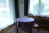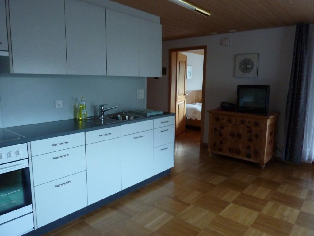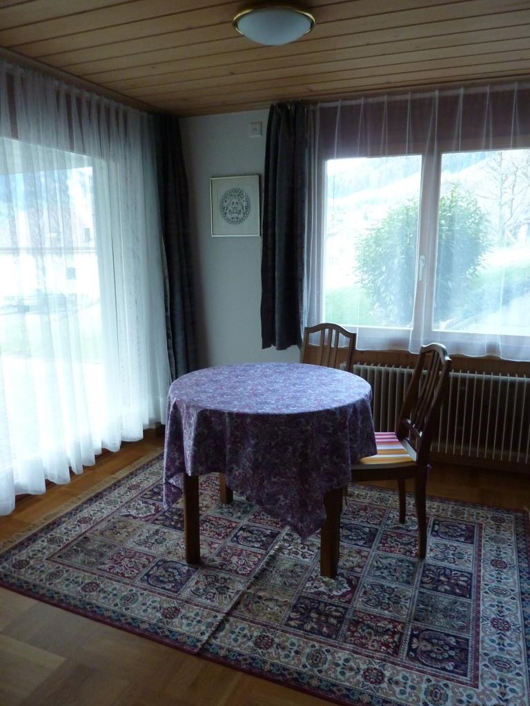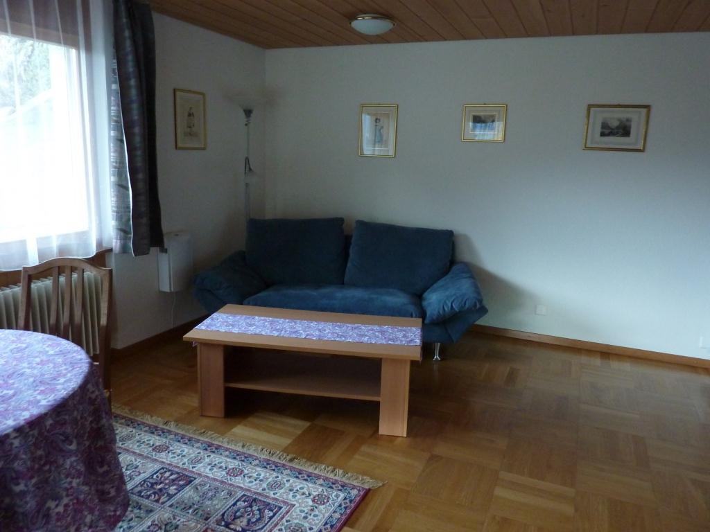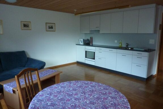2-Zimmer-Wohnung 50 m2, im Erdgeschoss, geräumig und hells. Offenes Wohn-/Esszimmer mit Esstisch, Kabel-TV, Radio und CD. Ausgang zum Gartensitzplatz. 1 Doppelzimmer mit Ausgang zum Gartensitzplatz. Dusche/WC. Offene Küche (4 Kochplatten, Backofen, Geschirrspüler, Glaskeramikherd, elektrische Kaffeemaschine). Gartensitzplatz und Rasen mit Terrassenmöbel und Liegestühlen. Sehr schöne Panoramasicht auf die Berge, das Tal und die Ortschaft. Internetanschluss, Nichtraucher-Unterkunft. Haustiere sind nicht erlaubt.
