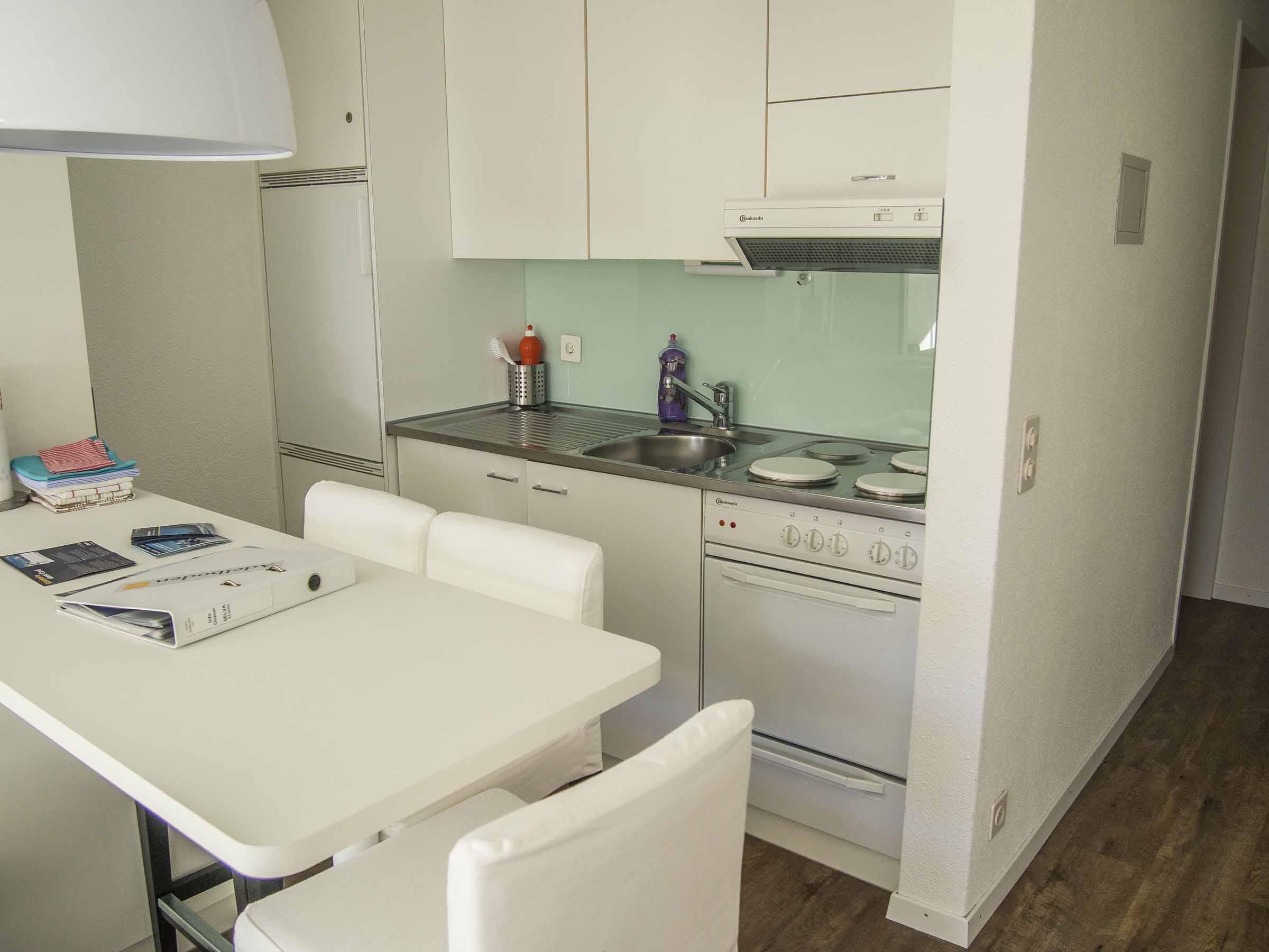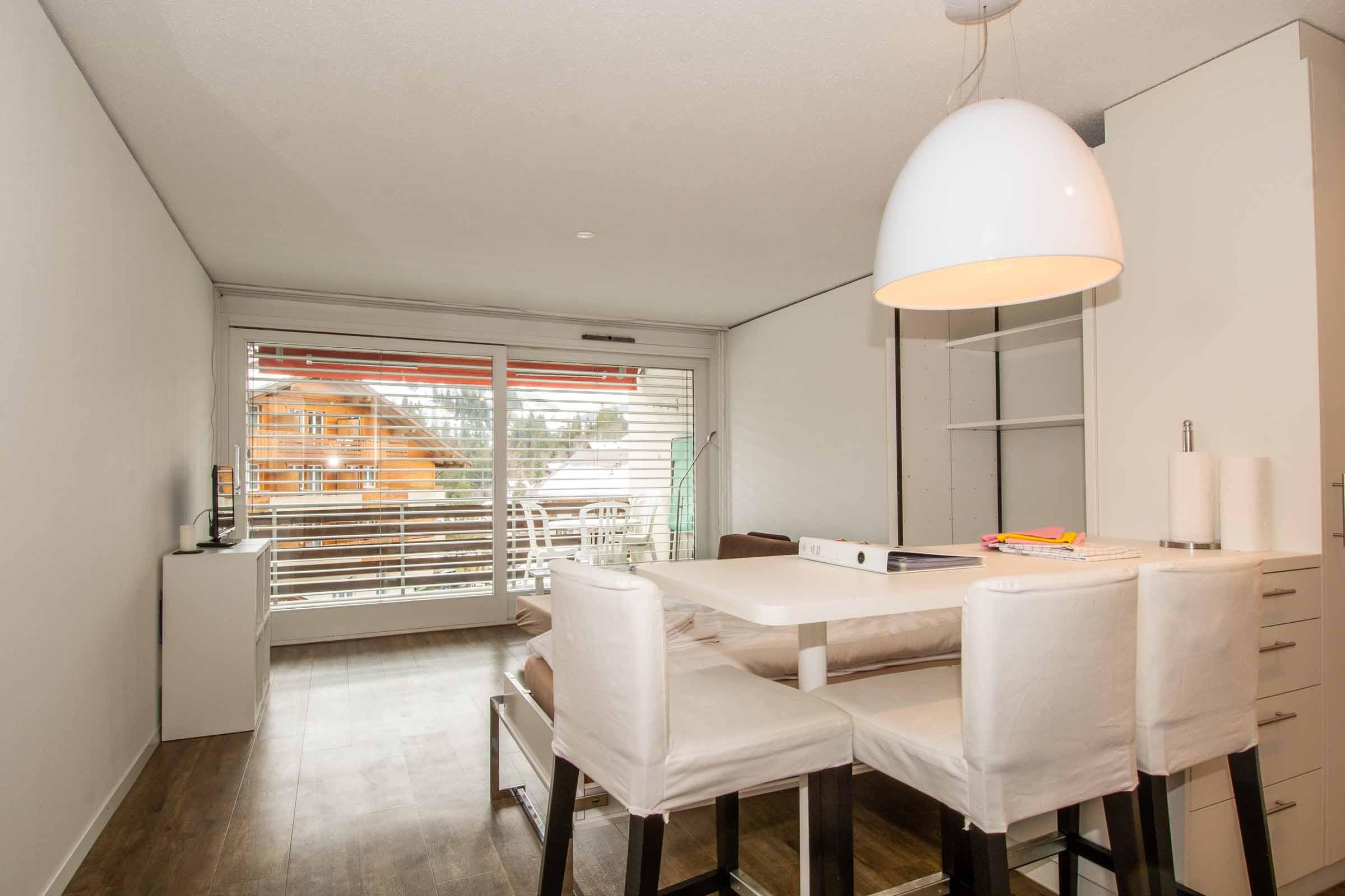 Die 1-Zimmerwohnung (29m2) befindet sich im Dorfzentrum, im 1. Stock eines Mehrfamilienhauses. Der Wohn- und Schlafbereich ist ausgestattet mit einem Schrankbett, einem Sofa das zu einem Bett umfunktioniert werden kann, einem Esstisch, TV und Radio/CD. Vom Balkon geniessen Sie einen herrlichen Blick auf die Berge. Die offene Küche ist mit allem nötigen ausgerüstet: Kochstelle, Backofen, Kühlschrank, usw. Das Badezimmer verfügt über Bad mit Duschvorrichtung, Waschbecken und Toilette. Garagenplatz, Waschmaschine, Trockenraum, Ski- und Abstellraum sind in der Liegenschaft vorhanden. Nichtraucherwohnung. Haustiere sind nicht erlaubt.