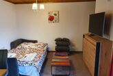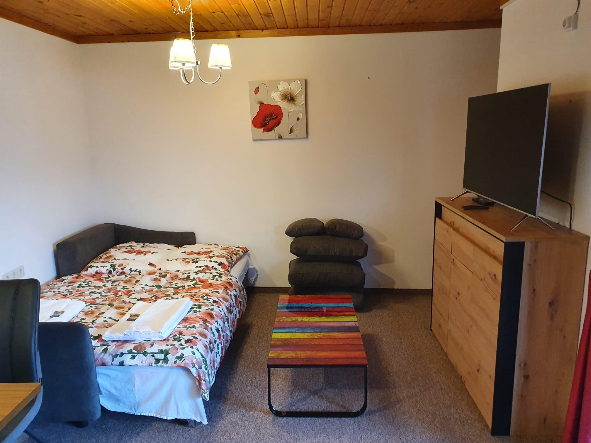 Im Wohnzimmer ist eine Essecke und eine bequeme Schlafcouch (1,4m)