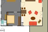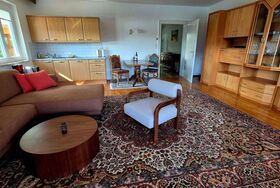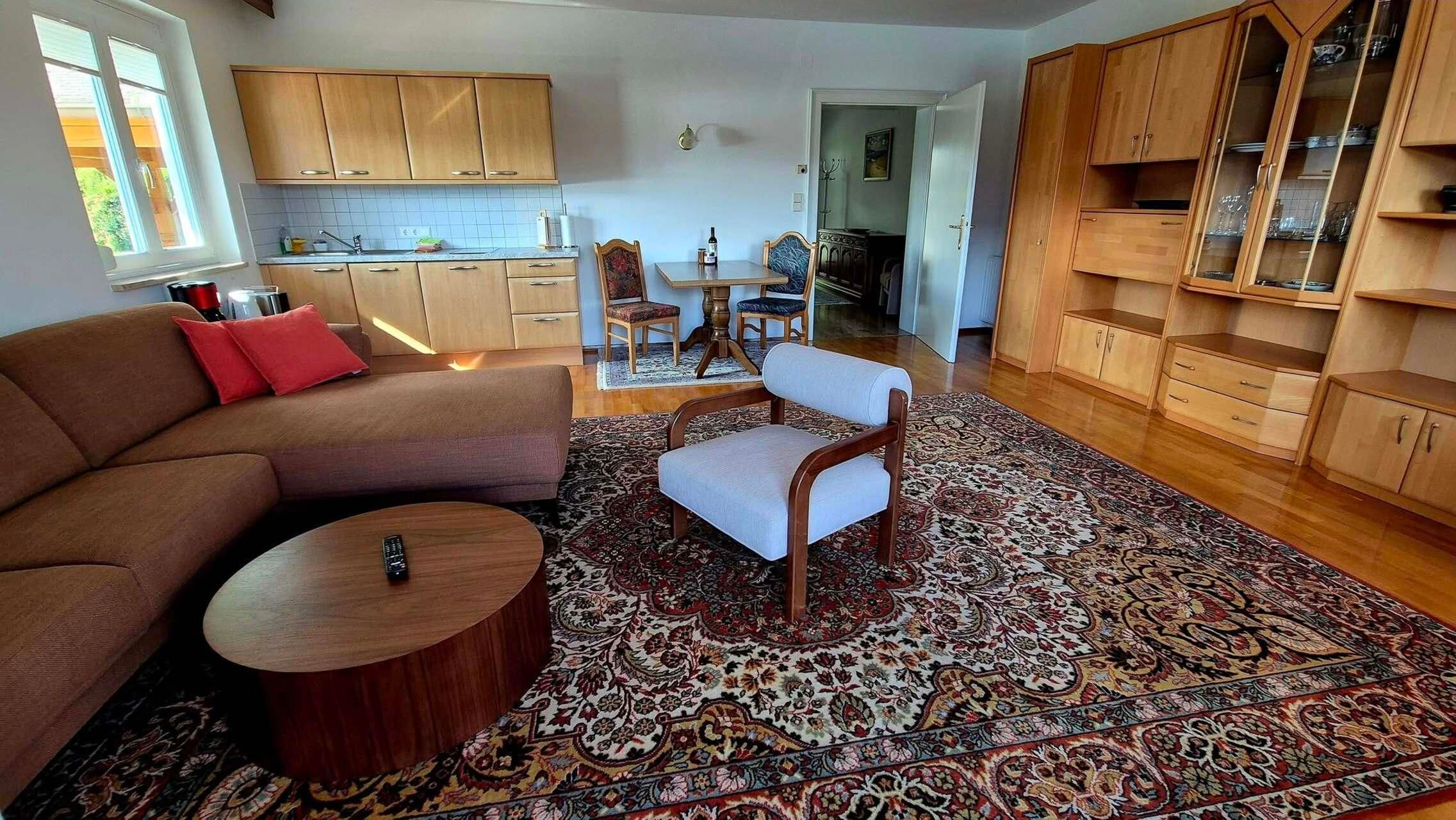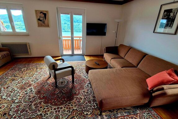 Appartement für 2-4 Personen mit Balkon und Seeblick, im 1. Stock auf der Süd-Westseite des Hauses. Die Wohnung ist ca. 63 m² groß und verfügt über ein großzügiges Wohnzimmer mit Kochzeile, ein separates Schlafzimmer und eine Dusche/WC.