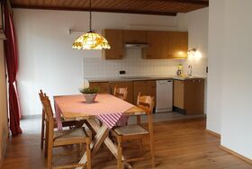 Das Wohnzimmer ist mit SAT TV und einem großen Esstisch ausgestattet - ideal für ein gemeinsames Familienfrühstück oder ein Abendessen mit Freunden. Die Kochnische ist mit Kochplatten, Mikrowellen/Grill Gerät, Kaffeemaschine und allen notwendigen Küchenutensilien (Kochtöpfe, Geschirr, Besteck, etc.) ausgerüstet.