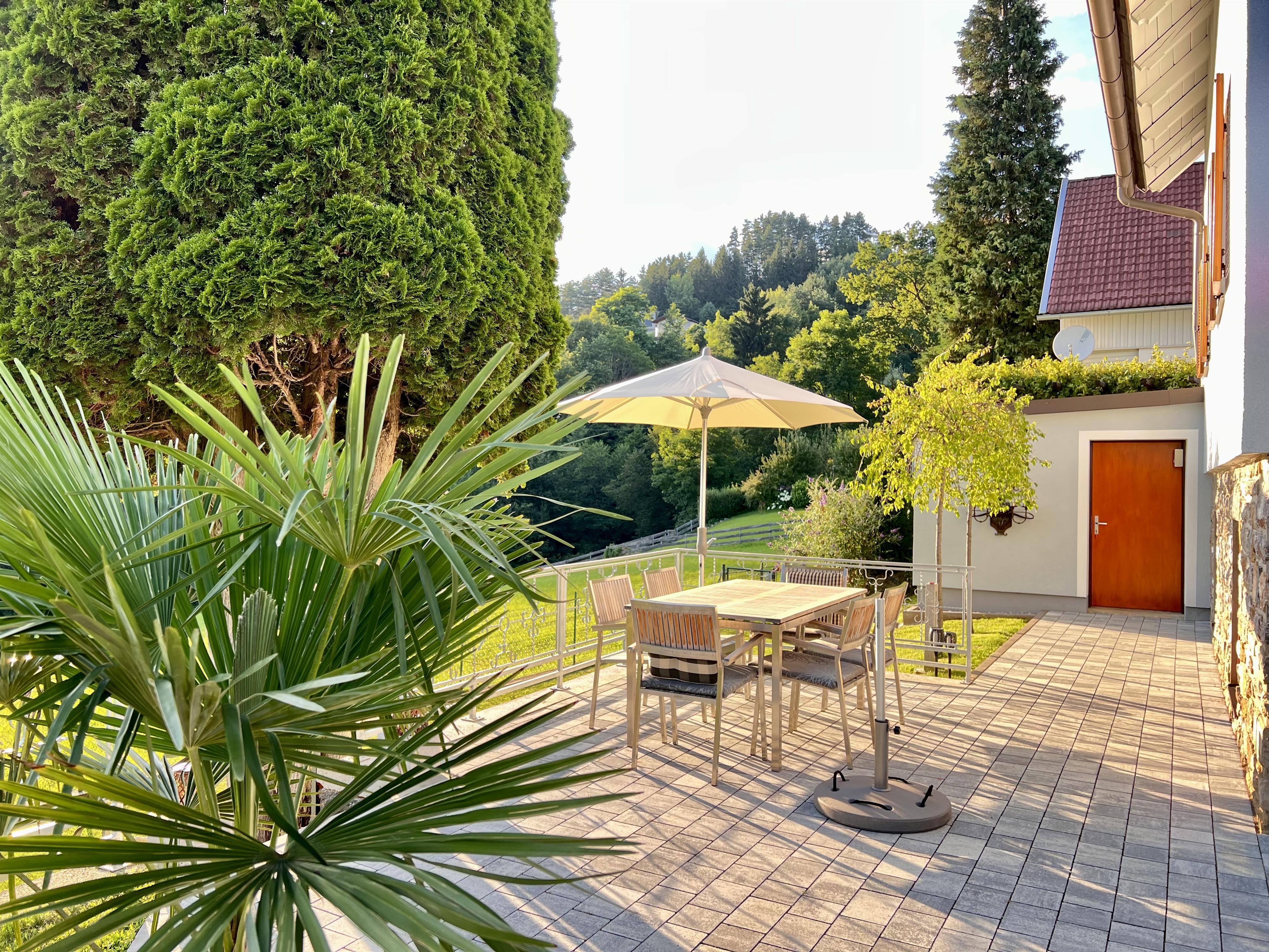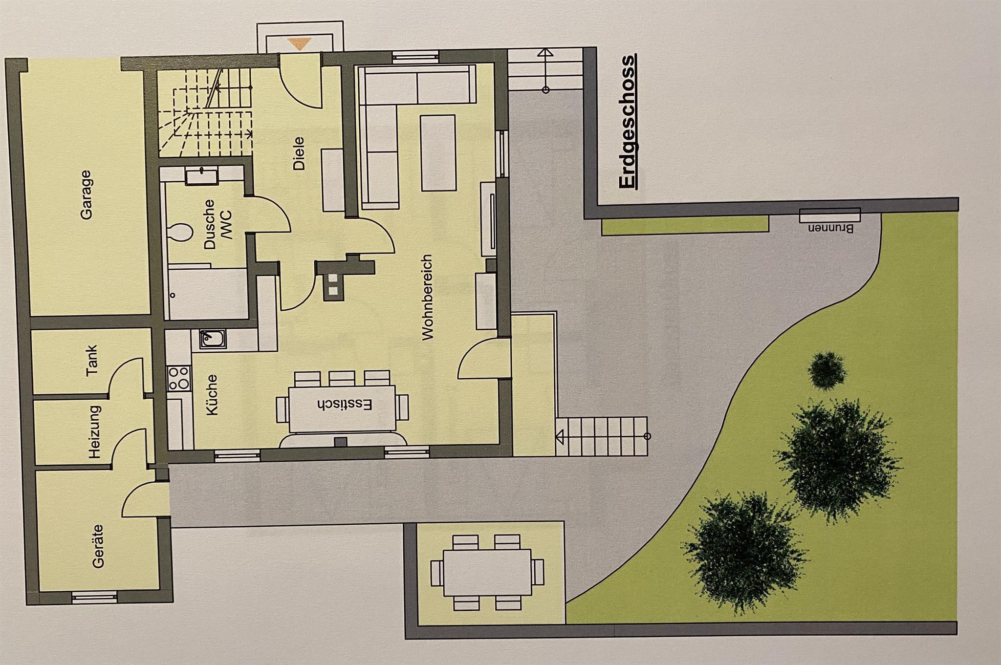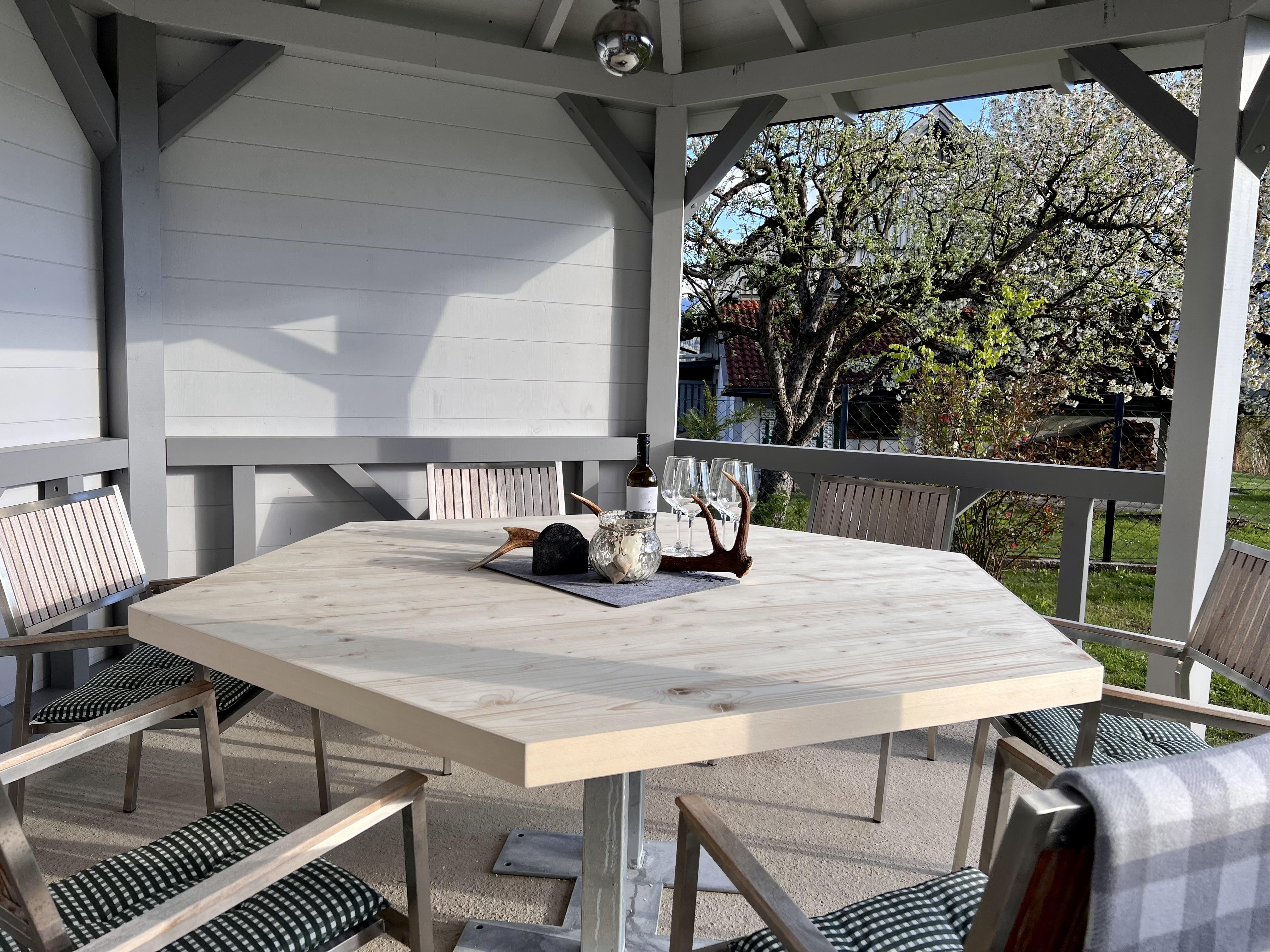 Terrasse möbliert mit Esstisch, Stühlen und Sonnenschirm; Sonnenliegen im Garten, Holzpavillon komplett ausgestattet mit Esstisch und Stühlen, Bäume als natürliche Schattenspender. Grill, Gartenfläche 2/3 eingezäunt; 1 abschließbare Garage und 2 kostenlose Autostellplätze im Freien;
