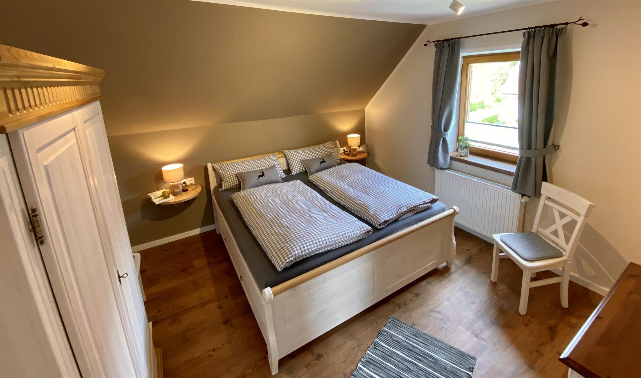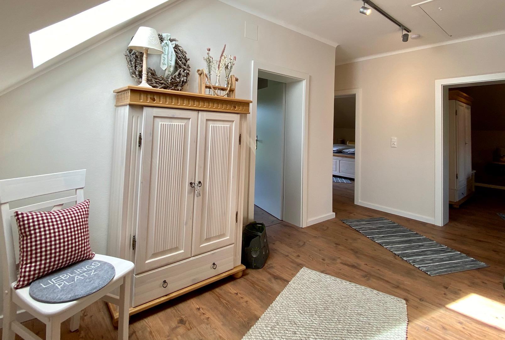 drei Schlafzimmer im Landhausstil mit Holzbodenoptik, Vollholzmöbeln und Doppelbett, liebevollen Details und Mansarde – zwei davon mit Balkon; allesamt mit Fensterläden zum Verdunkeln, zusätzliches Duschbad / WC mit Waschbecken;