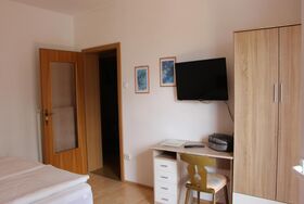 Unsere “große” Ferienwohnung mit ca. 55 m2, für 2 bis 3 Personen mit großzügigem Wohn- Schlafraum, Südbalkon, Dusche/ WC, Radio, Sat-TV, Haarfön, Vorraum, im Kinderzimmer wäre auch Platz für 2 Kinder.