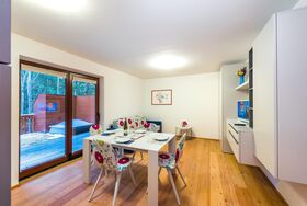 Wohnraum/Essraum mit offener Kochnische sowie Doppelschlafcouch und Balkon, ein Schlafzimmer mit Doppelbett, Badezimmer (Dusche/WC/Bidet) und einen Schistall.