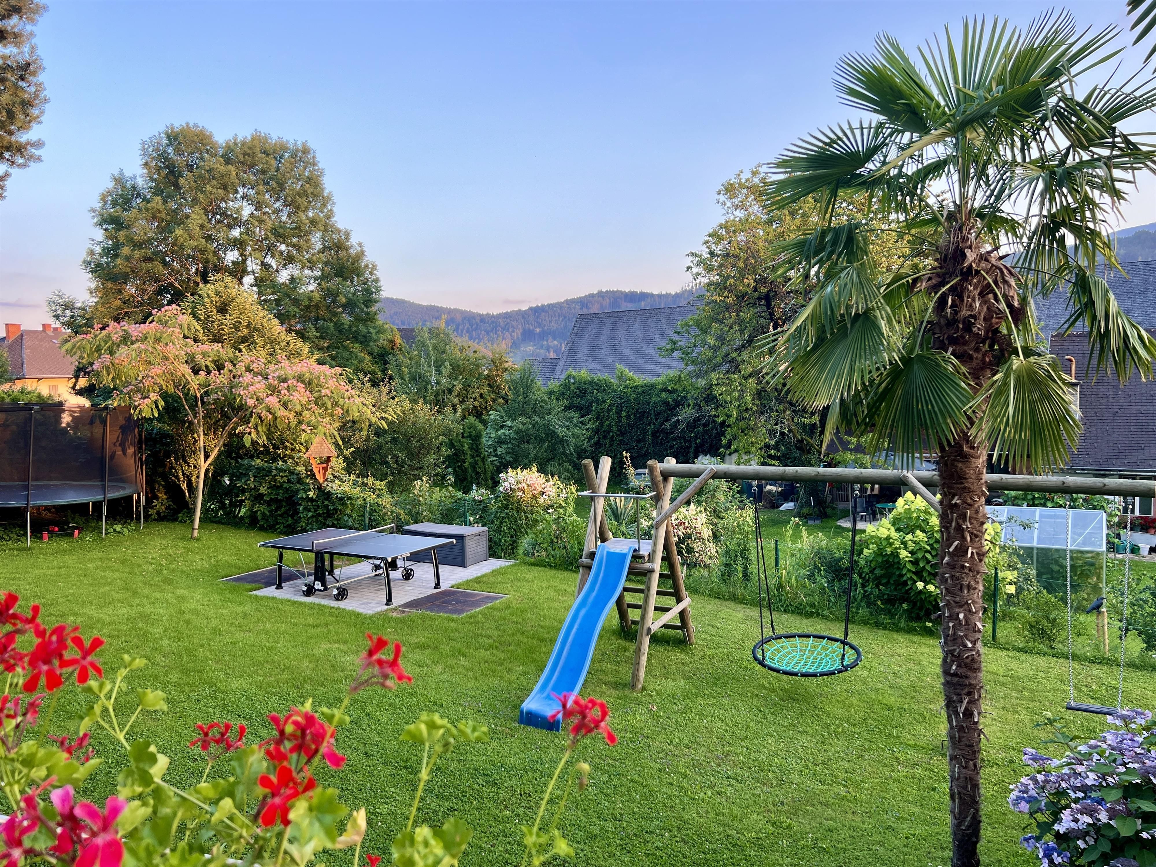 Ein 500 m² großer Garten mit Pavillon, Grill, Spielplatz, Trampolin, Tischtennis und einer weitläufigen Wiese lädt zum Entspannen und Spielen ein. Zudem steht ein 50 m² großer Spielraum mit Billardtisch, Tischfußball, Darts sowie vielen Spielen und Büchern für Groß und Klein zur Verfügung.