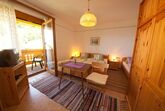 Das Zimmer ist mit Sat-TV, Dusche und WC, einem großen Doppelbett, einem Einzelbett, Balkonstühle und einem Tisch ausgestattet.