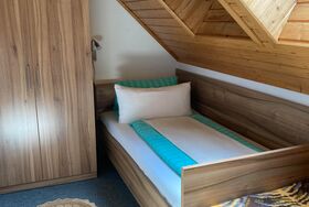 Aufteilung der Schlafzimmer: Ein Elternschlafzimmer, drei Betten und ein Kinderzimmer mit zwei Betten.