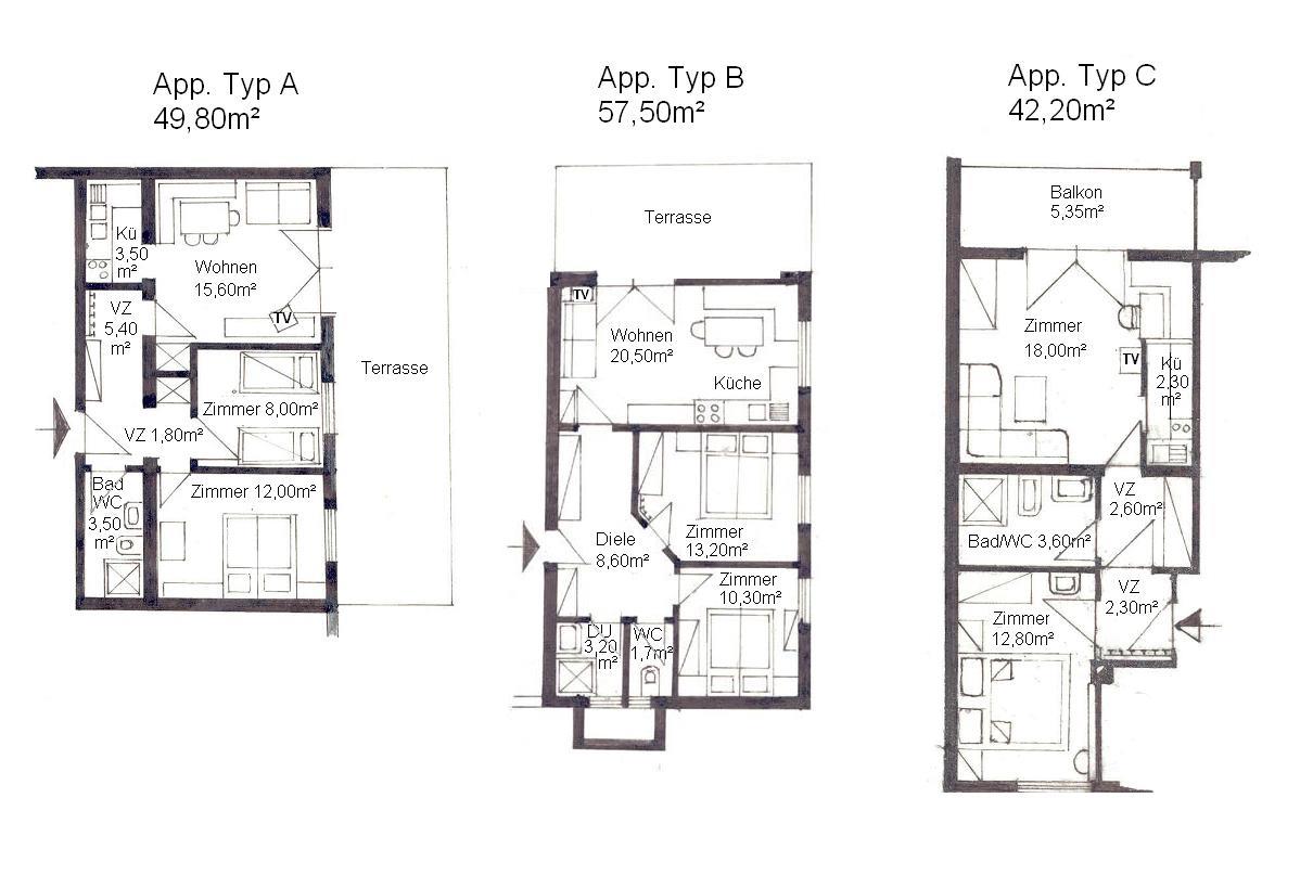 Die Wohnung besteht aus einem Wohnraum mit Sitz- und Wohnecke, mit SAT/TV und Küche, 2 getrennten Doppelzimmern, Dusche und WC getrennt sowie Terrasse oder Balkon.