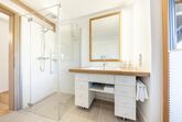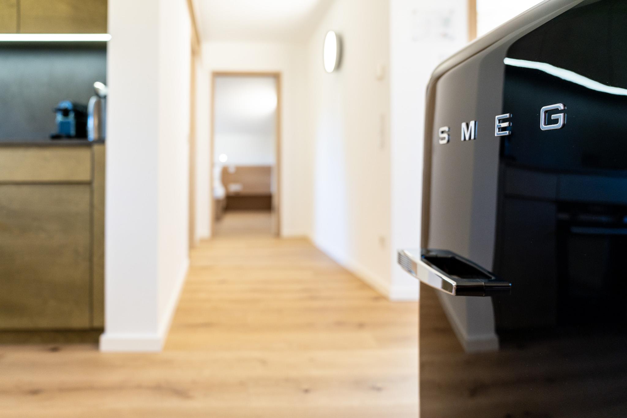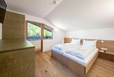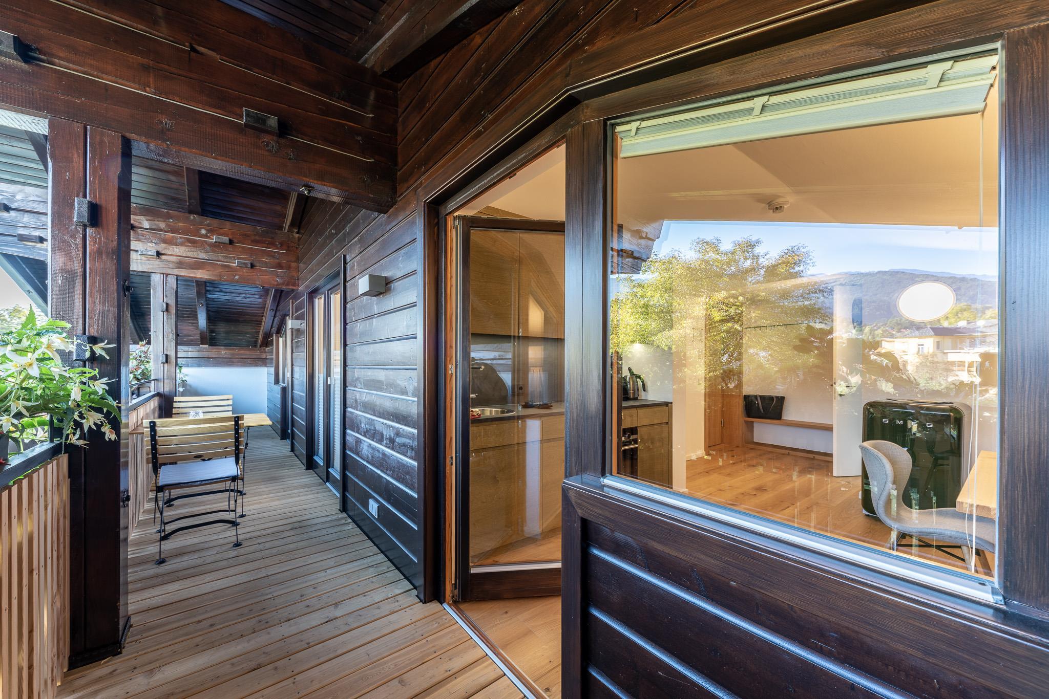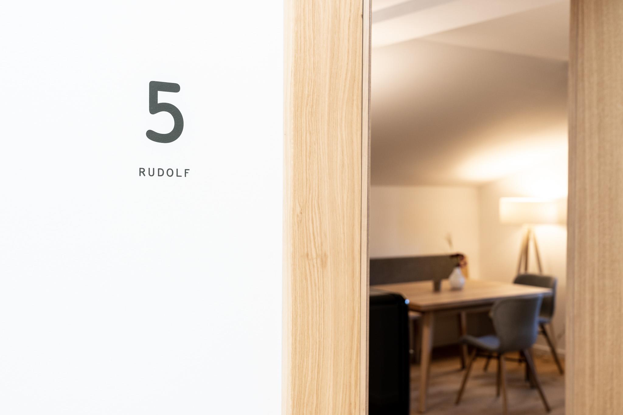 Klein aber fein – zum Appartement Rudolf im Dachgeschoss gelangt man mit dem Lift (bis zum 2.OG) und dann über ein paar letzte Stufen unters Dach. Mit dem großem Balkon, getrenntem Wohn- und Schlafraum, voll ausgestatteter Küche und einer Badewanne mit Blick auf die Berge ist dieses Appartement der ideale Ort für den Rückzug zu Zweit.
