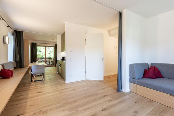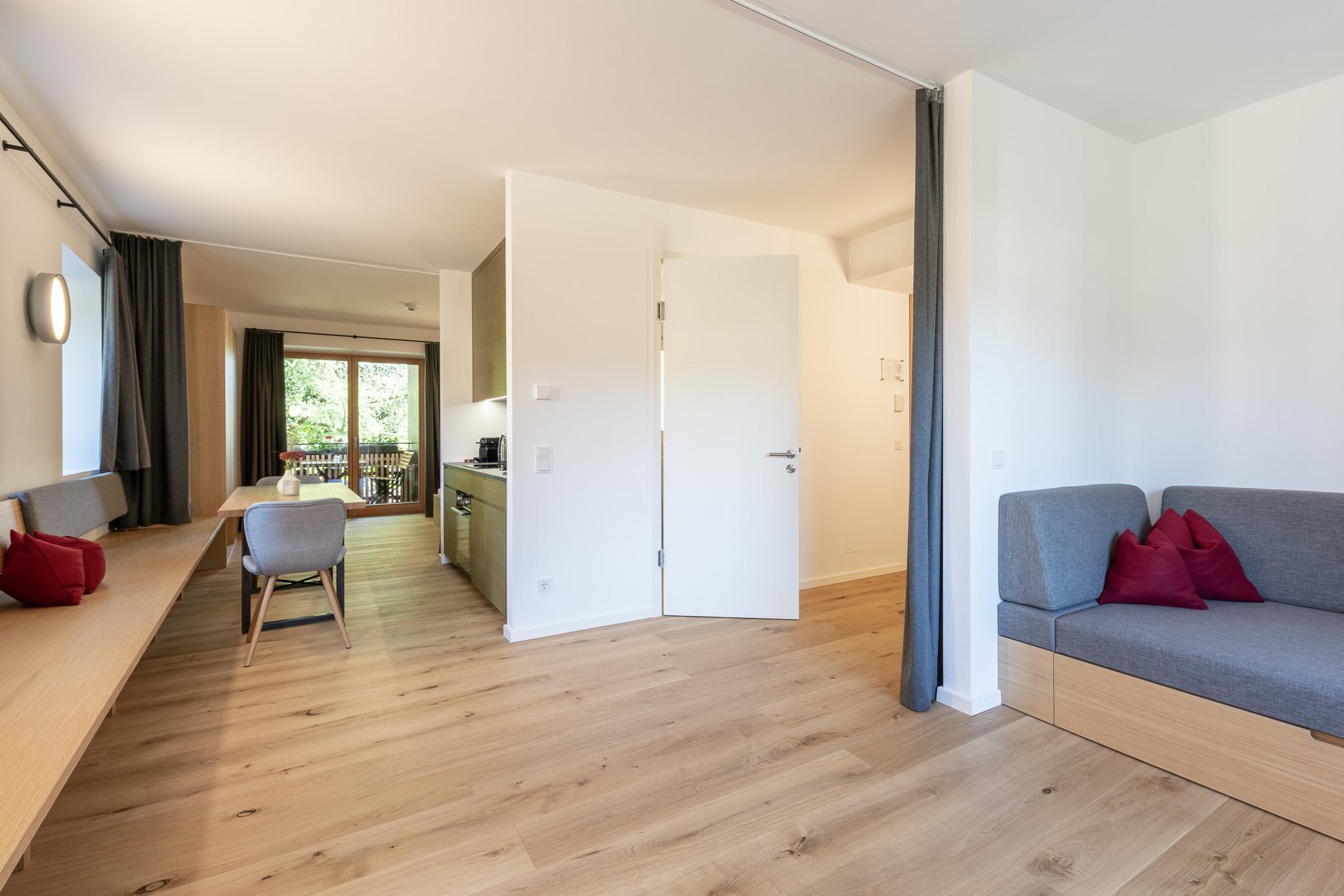 UNSERE APPARTEMENTS SIND EINE FREUDE FÜR ALLE SINNE Allein der Duft der naturbelassenen heimischen Hölzer wie Lärche und Eiche – schonend gebürstet, geölt, gewachst oder gekalkt – wirkt entspannend. Durch das Zusammenspiel von Holz und viel natürlichem Licht entsteht ein stimmungsvolles Wohngefühl.