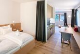 Das loftartige, komfortabel ausgestattete Appartement Kranbirn liegt im 1. Obergeschoss und ist mit dem Lift errreichbar. Der großzügige Wohn-Schlafraum bietet mit einem Doppelbett und einem Schlafsofa Platz für bis zu vier Personen. Die Kochecke ist komplett bestückt mit allem was man zum Kochen benötigt. Der heimelige Balkon Richtung Garten macht dieses Appartement zum perfekten Ort für entspannte Tage