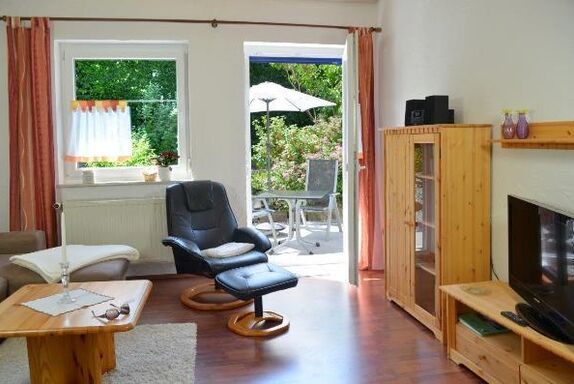 3 - Raum Ferienwohnung Nr. 1 mit Terrasse, ca. 60 m² (2 - 3 Pers.) im Erdgeschoss: gemütl. Wohnschlafraum (1 Pers.), komfortable Wohnküche mit Spülmaschine und Backofen, Schlafraum (Ehebett), DU/WC, Garderobe, inkl. sämtl. Wäsche