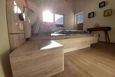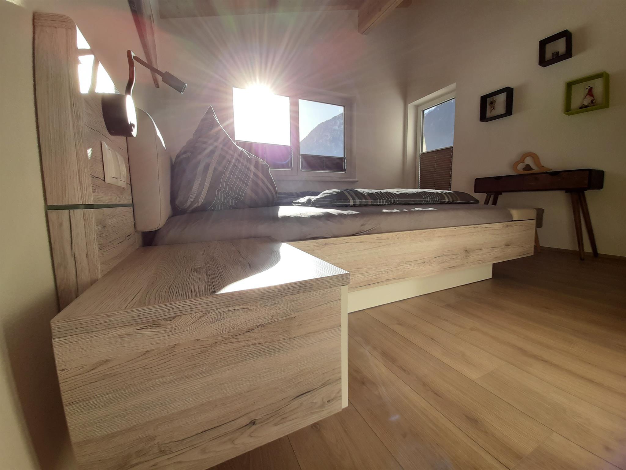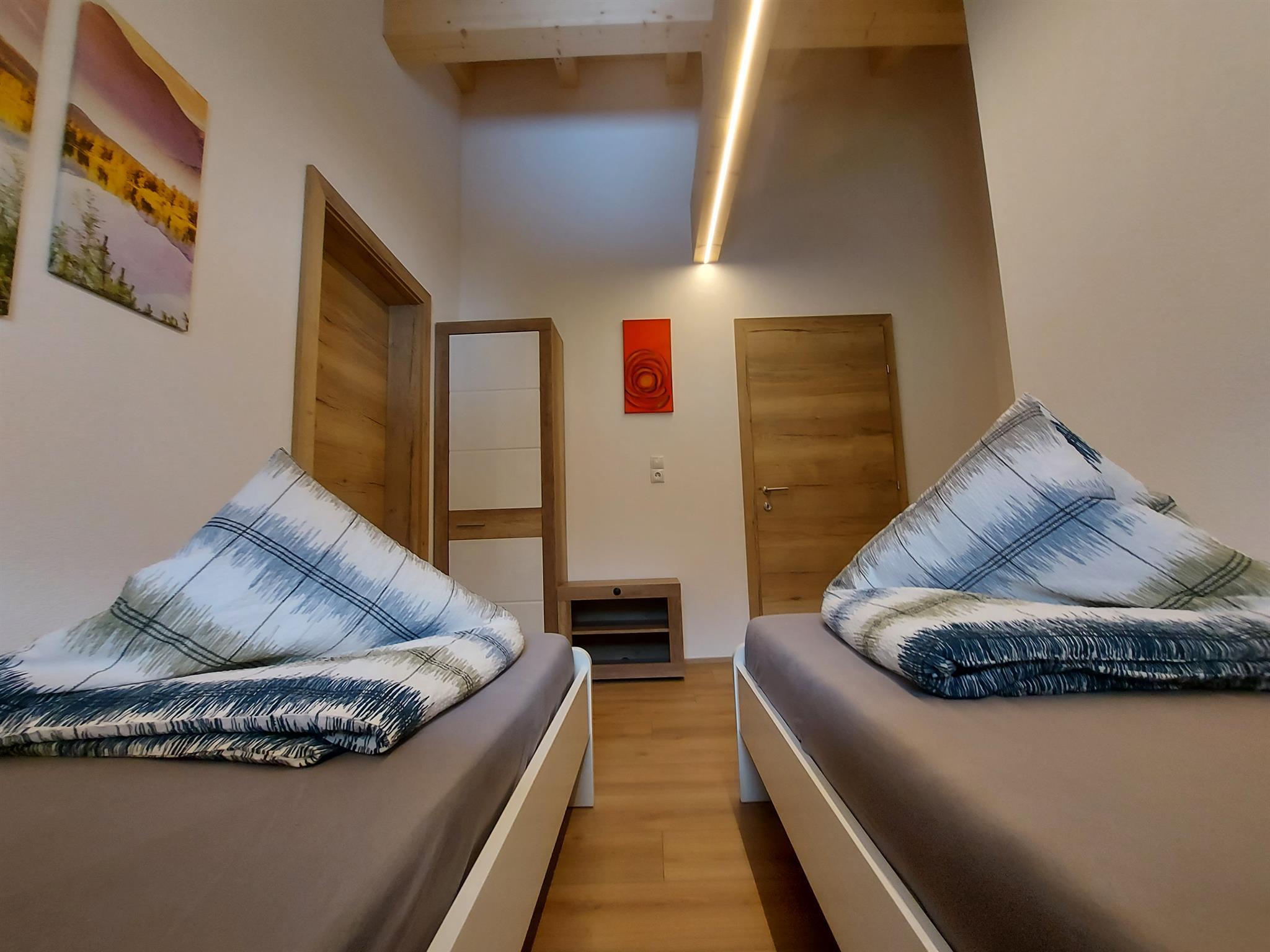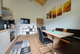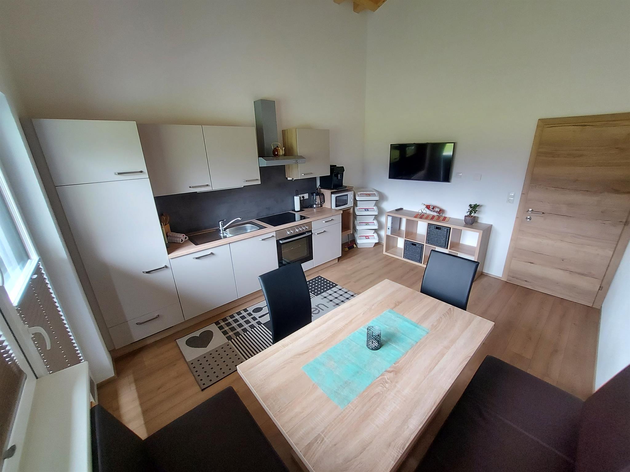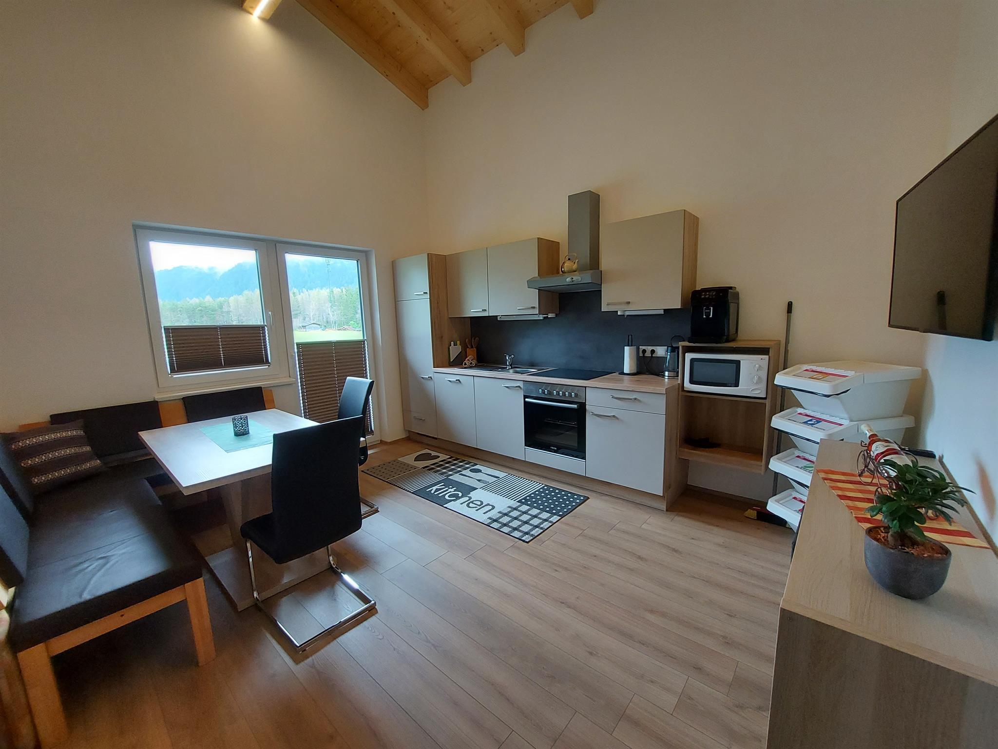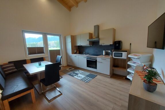 Eine großzügige Wohnküche mit einem Wohn- und Essbereich mit Geschirrspüle, Mikrowelle, Kaffeevollautomat, Flachbild-Sat-TV. Ein Doppelzimmer mit Zugang zu einem Zweibettzimmer mit 2 Einzelbetten. Ein Badezimmer mit Dusche und WC. Genießen Sie im Apartment einen den Balkon mit Bergblick.