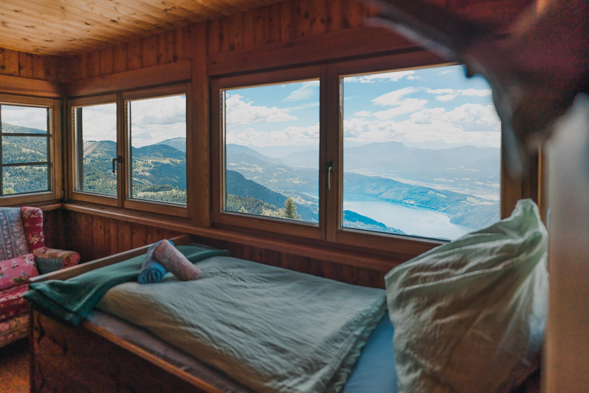 Der Ostbalkon des Zimmers bietet einen seitlichen Blick auf den Millstätter See und eröffnet einen malerischen Ausblick auf die sanften Grasgipfel der Millstätter Alpe. Besonders der Sonnenaufgang lässt sich von hier aus in seiner ganzen Pracht genießen.