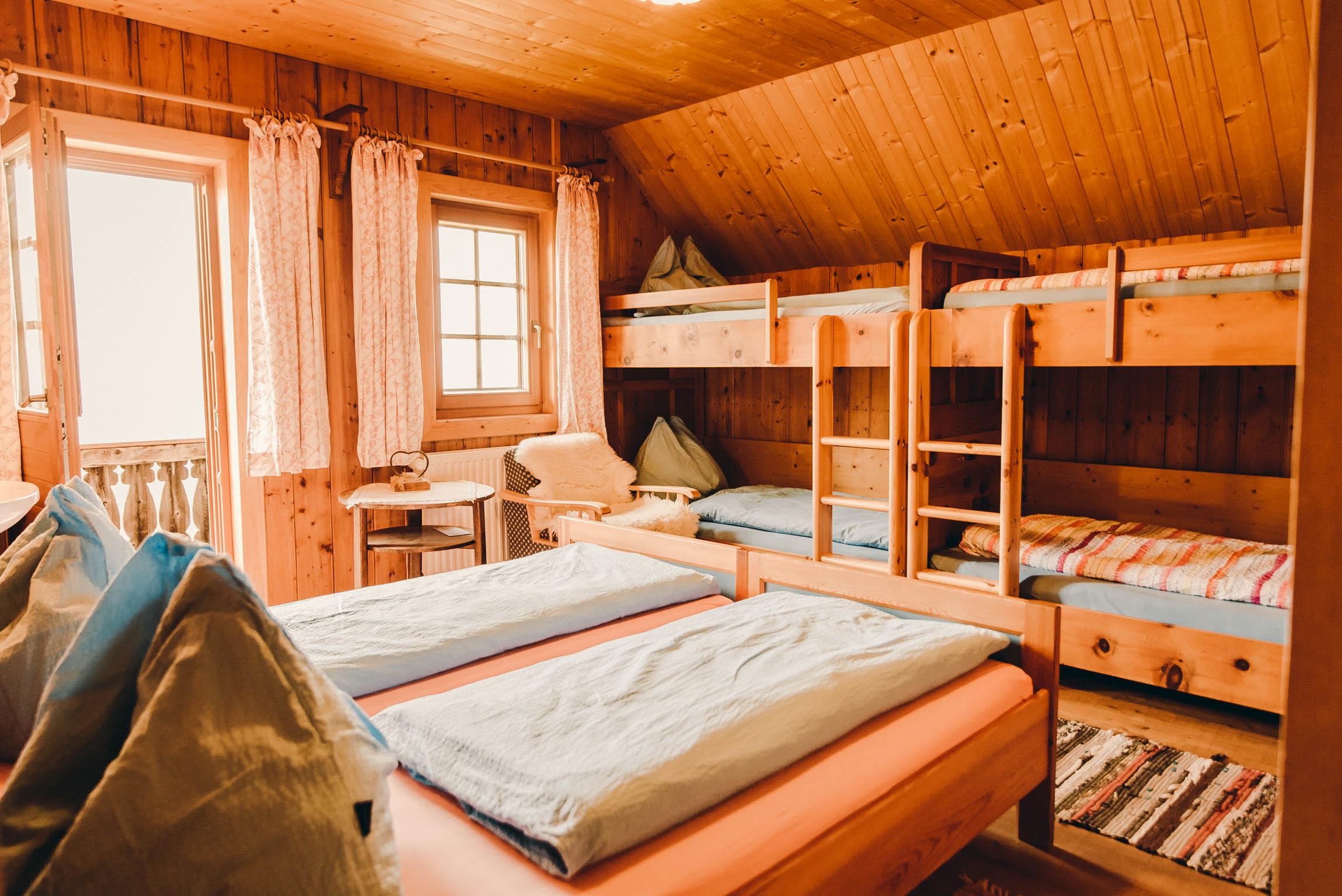 Eine Dusche und ein WC befinden sich auf derselben Etage. Das 6-Bettzimmer „Mirnock“ ist besonders bei Familien und Freundesgruppen beliebt und eignet sich perfekt für einen längeren Aufenthalt auf der Alm.