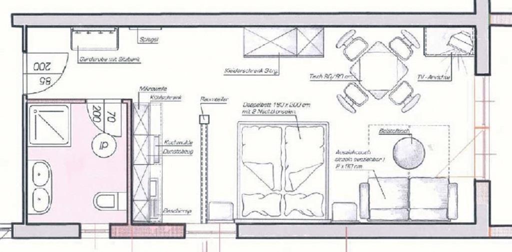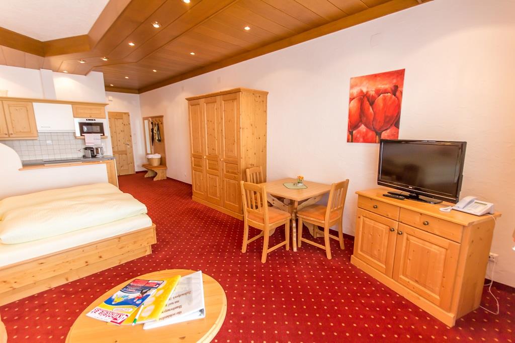 bestehend aus einem Wohn-Schlafraum mit Ausziehcouch, Kochnische mit Geschirrspüler, Espresso Kaffeemaschine und Mikrowelle, Dusche und WC, LCD-TV mit Radio, Westterrasse, Nichtraucher-Appartement