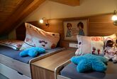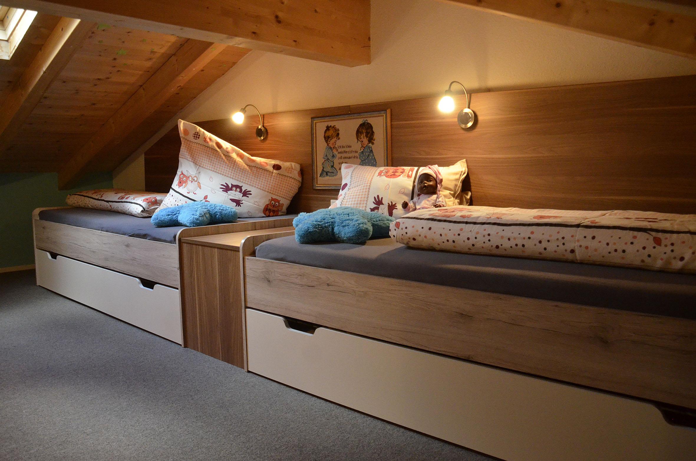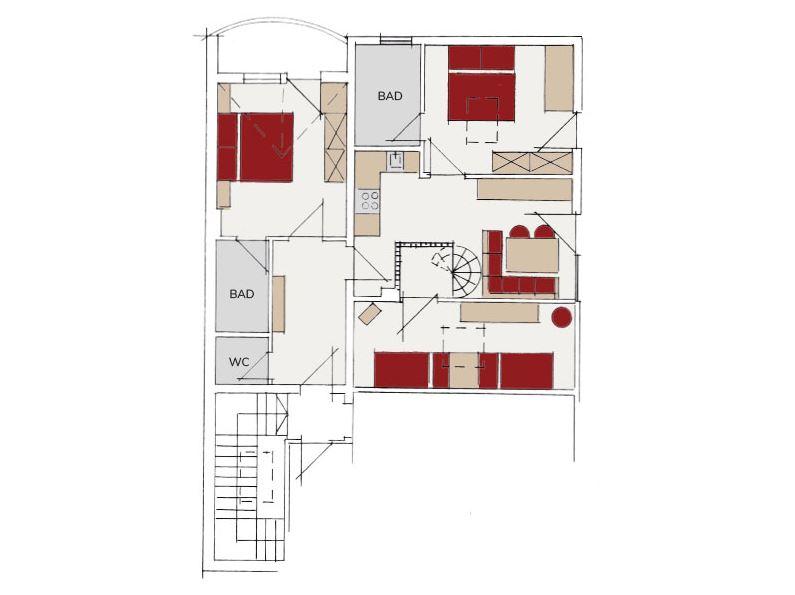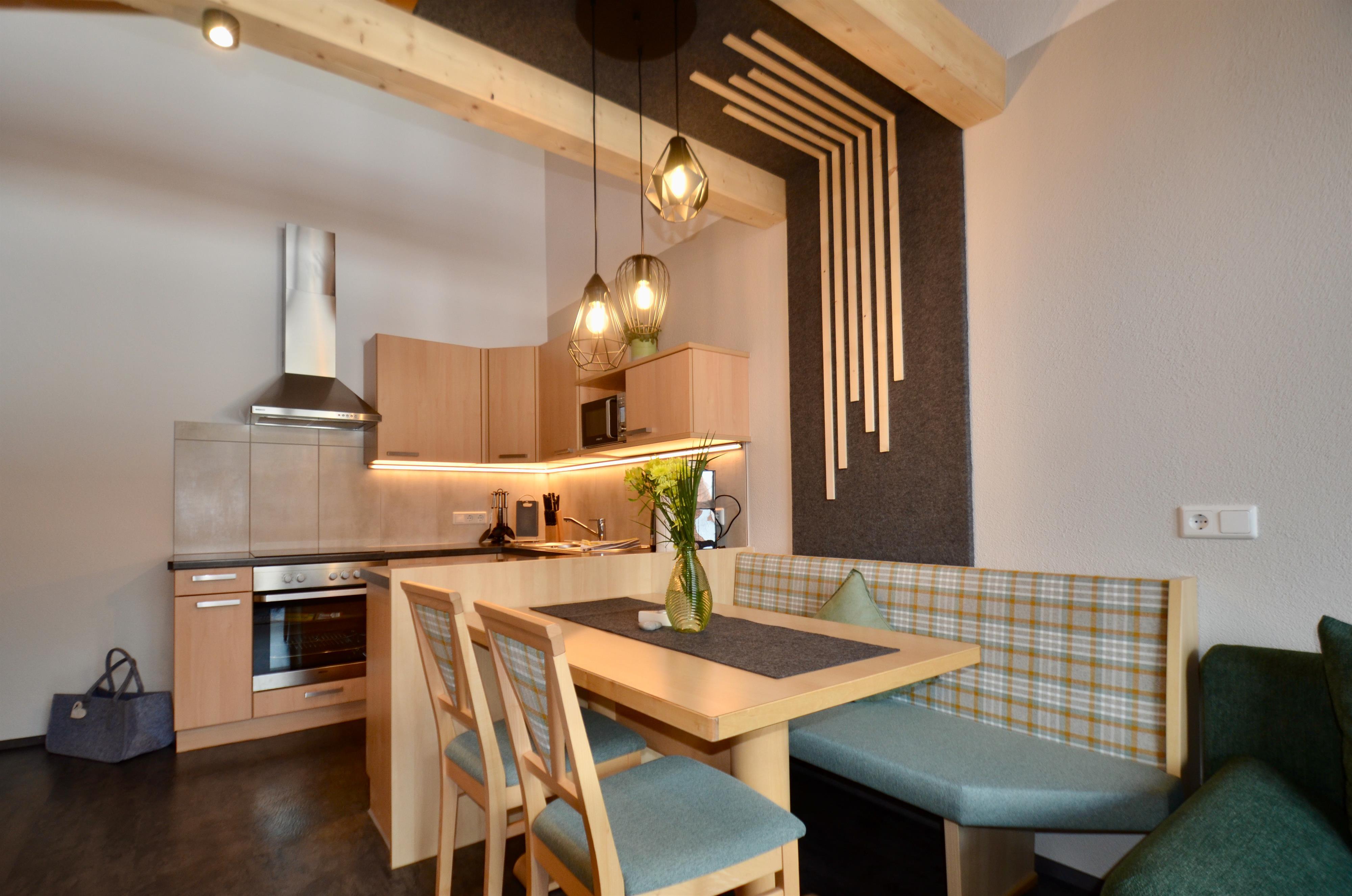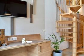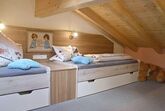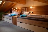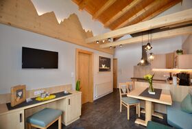 Das Appartement Bergzauber mit ca. 75 m² erstreckt sich über zwei Etagen. Unten befinden sich zwei Doppelzimmer mit jeweils Dusche/WC, Haarföhn, Pflegeprodukte; gemütliches Wohnküche mit Sitzecke, Satelliten-Flat TV, komplett ausgestattete Küchenzeile mit Spülmaschine, Cerankochfeld mit Backofen, Wasserkocher, Kaffeemaschine, Kühlschrank, Mikrowelle uvm.; in der oberen Etage mit Dachschräge – durch eine Holztreppe erreichbar - befindet sich ein Kinderzimmer mit zwei Schubladenbetten für bis zu 4 Kinder (niedrige Raumhöhe); 2 möbilierte Balkone zum Sonne tanken.