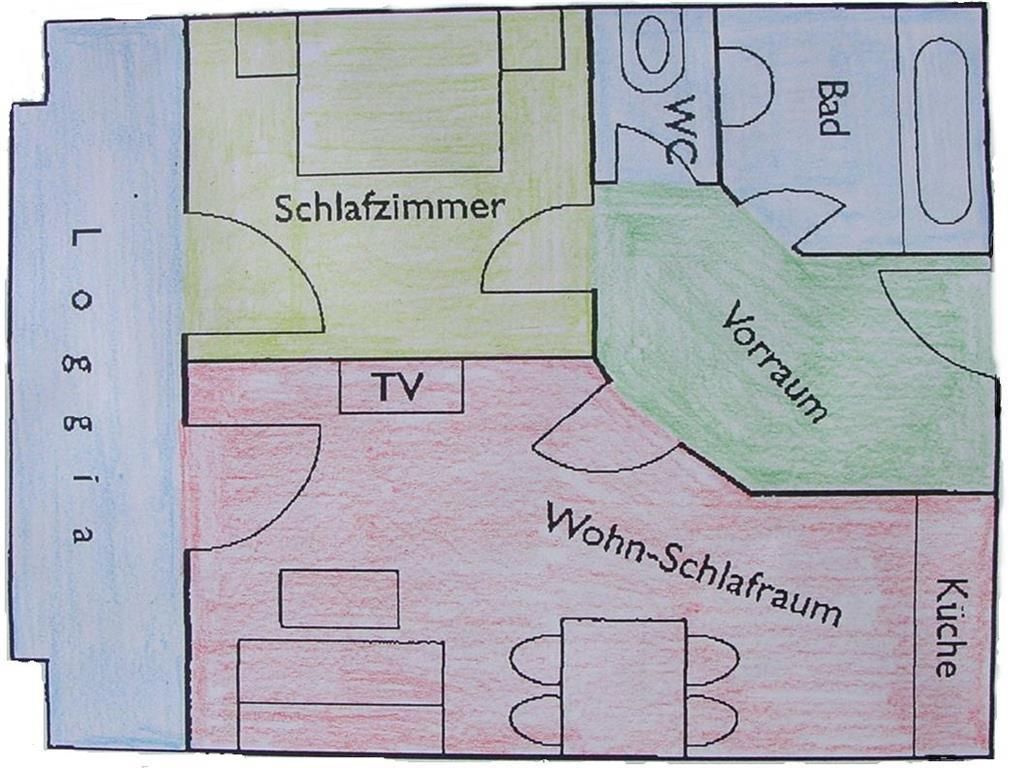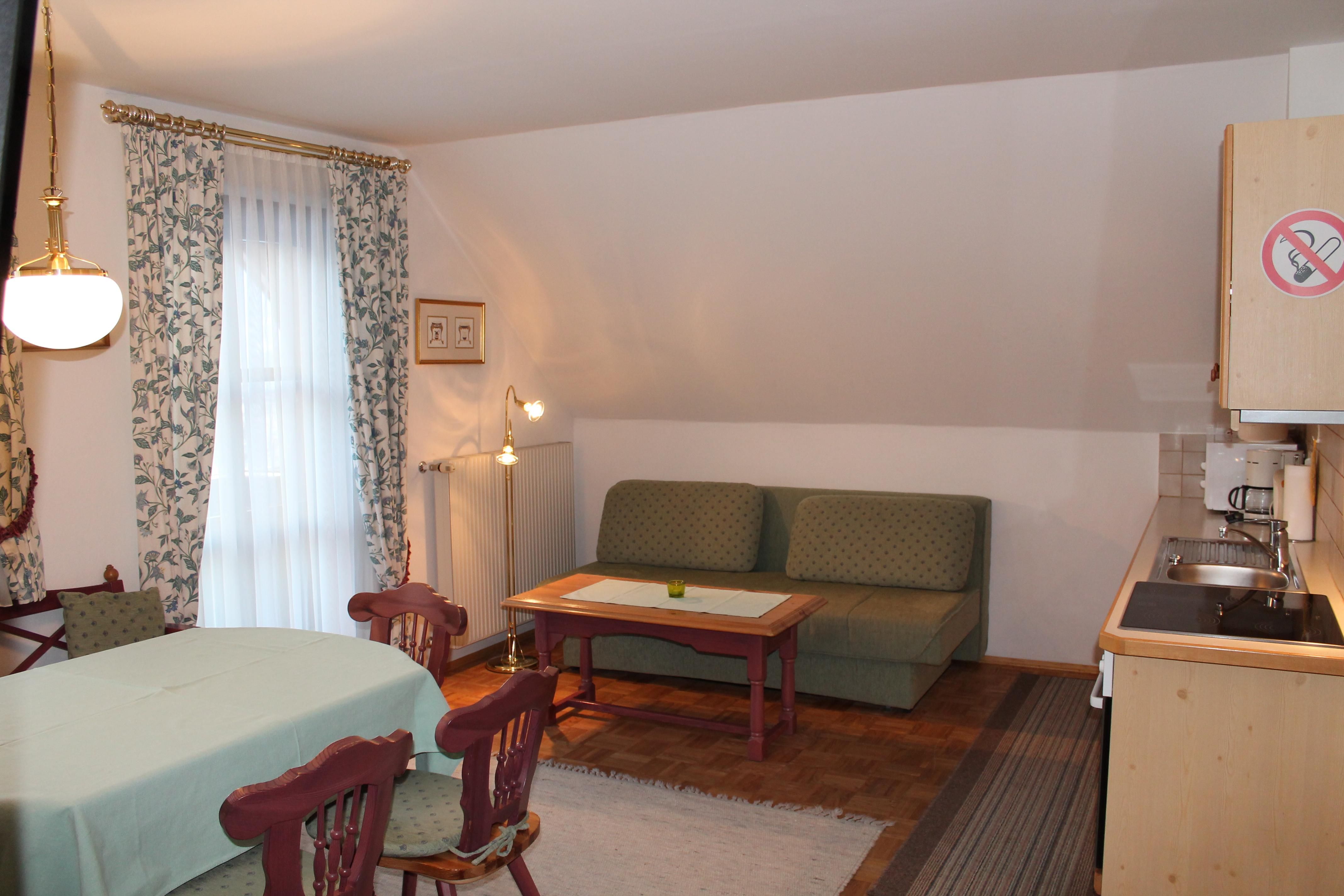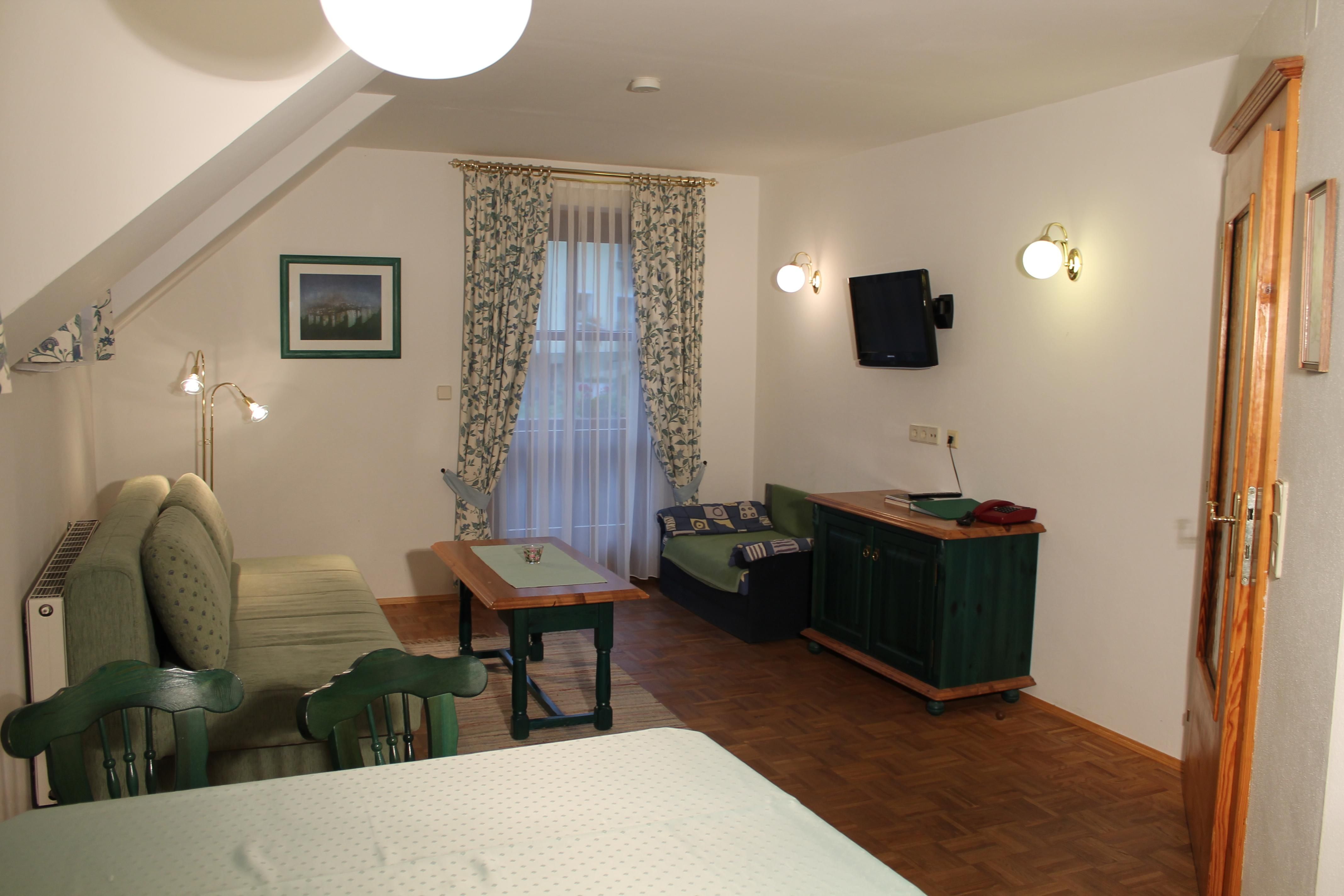 Die in Richtung Westen zur Morgensonne ausgerichtete Ferienwohnung bestehend aus einem Doppelzimmer, einem großen Wohn- Schlafraum mit ausziehbarer Doppelcouch und komplett eingerichteter Küchenecke, Bad/WC, Farb-SAT-TV (Flat TV), Radio, Telefon, Wireless Internet und großem Balkon. Die Ferienwohnung hat die ideale Größe für Familien mit 4 Personen und mit einem Zusatzbett finden darin auch 5 Personen Platz.