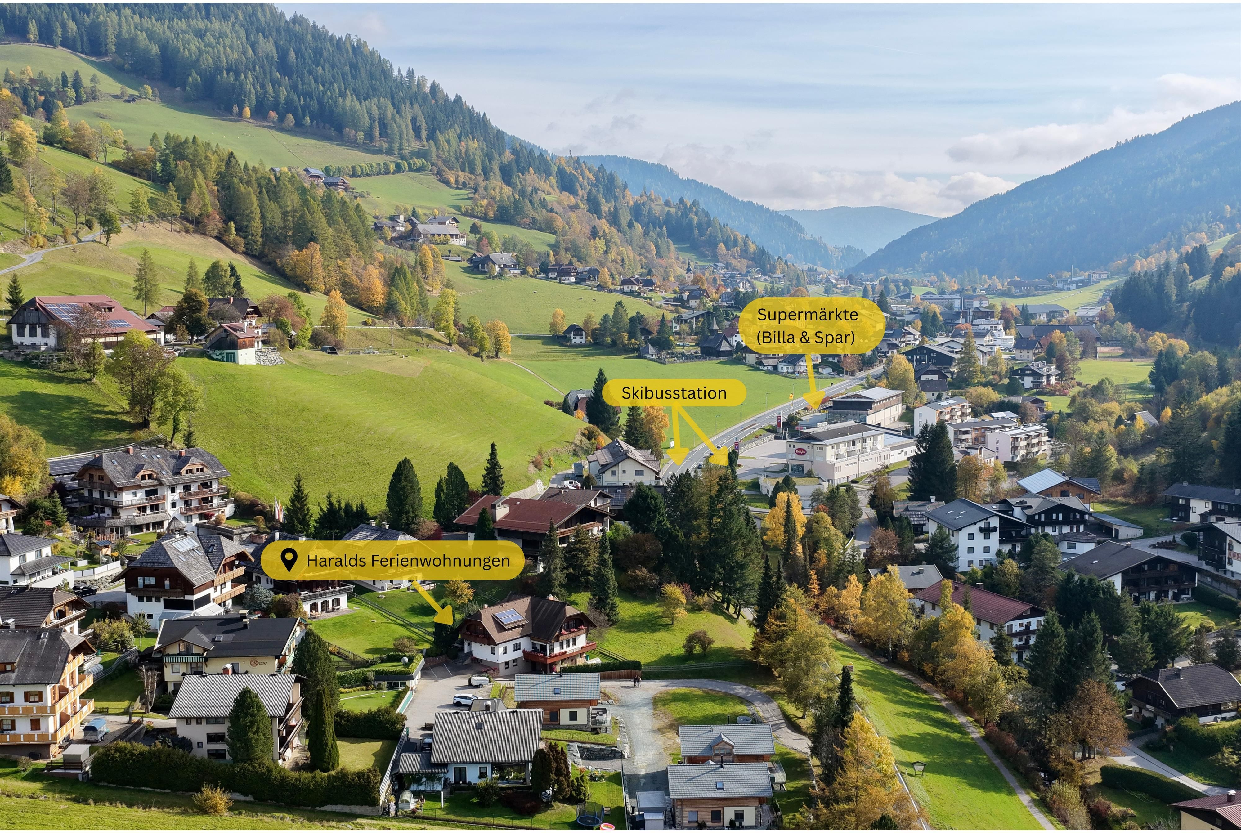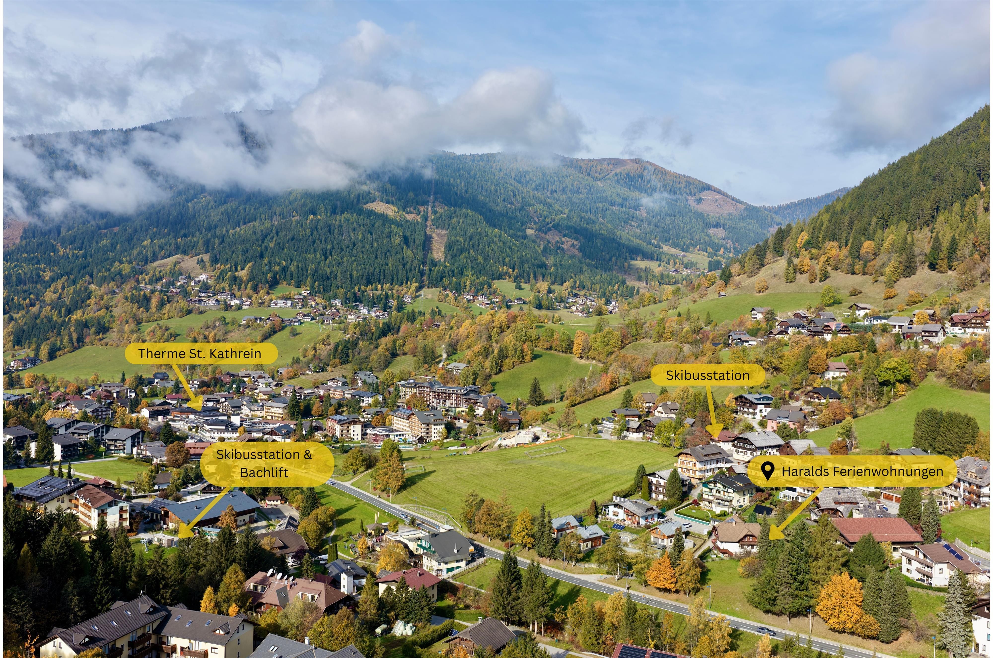 In unmittelbarer Nähe befinden sich namenhafte Wellness- und Freizeiteinrichtungen, darunter die familienfreundliche Therme St. Kathrein (nur 400 m entfernt) und das Thermal Römerbad (1 km). Skibegeistere werden die Nähe zu der Kaiserburgbahn, Maibrunnbahn und Sonnwiesenbahn schätzen. Wanderwege als Ausgangspunkte für herrliche Winterspaziergänge liegen rund um unser Ferienwohnhaus, sowie 3 Shuttlebushaltestellen.