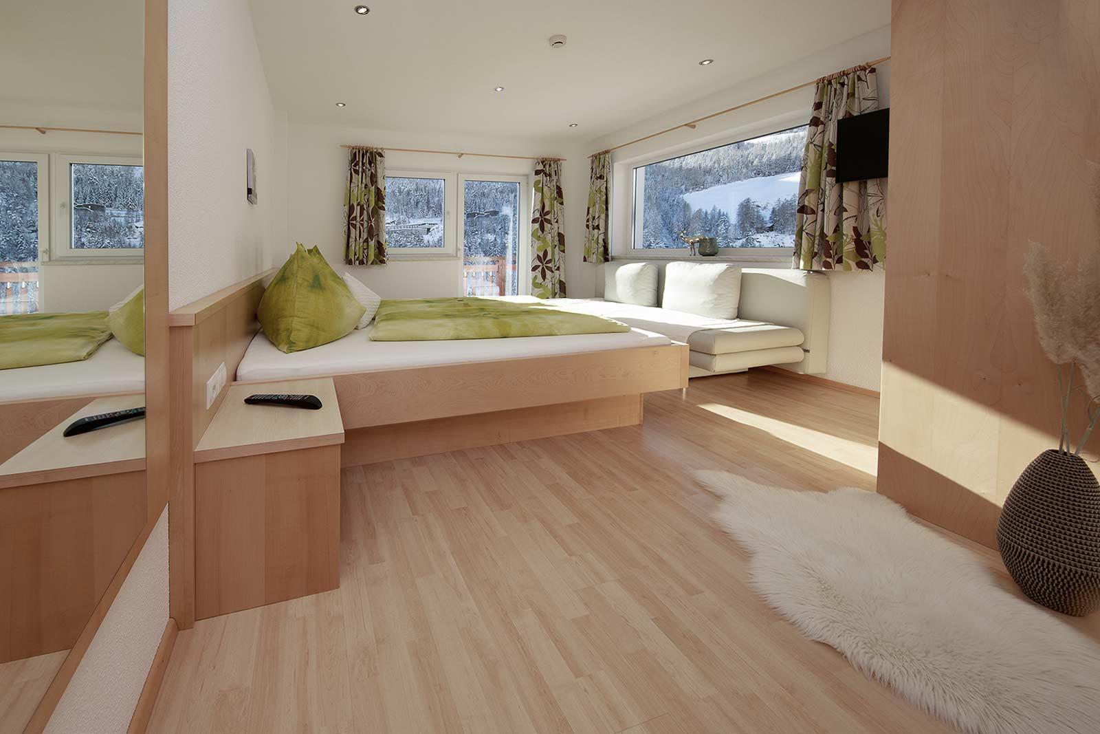 Modernes und neues Appartement für 4 Personen (ca. 60 m²), 1 Doppelzimmer mit Doppelbett und Sofa, 1 Zweibettzimmer mit 2 Einzelbetten, 2 Badezimmer (1x Dusche/WC, 1x Dusche und sep. WC), voll ausgestattete Wohnküche mit gemütlicher Essecke und Sofabed für ein Kind. Beide Schlafzimmer und Wohnküche mit Kabel-Flat-TV. Balkon oder Terrasse zur Süd-West-und Ostseite.