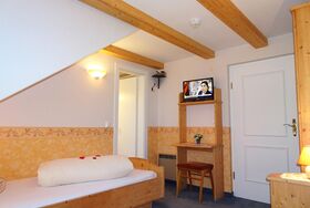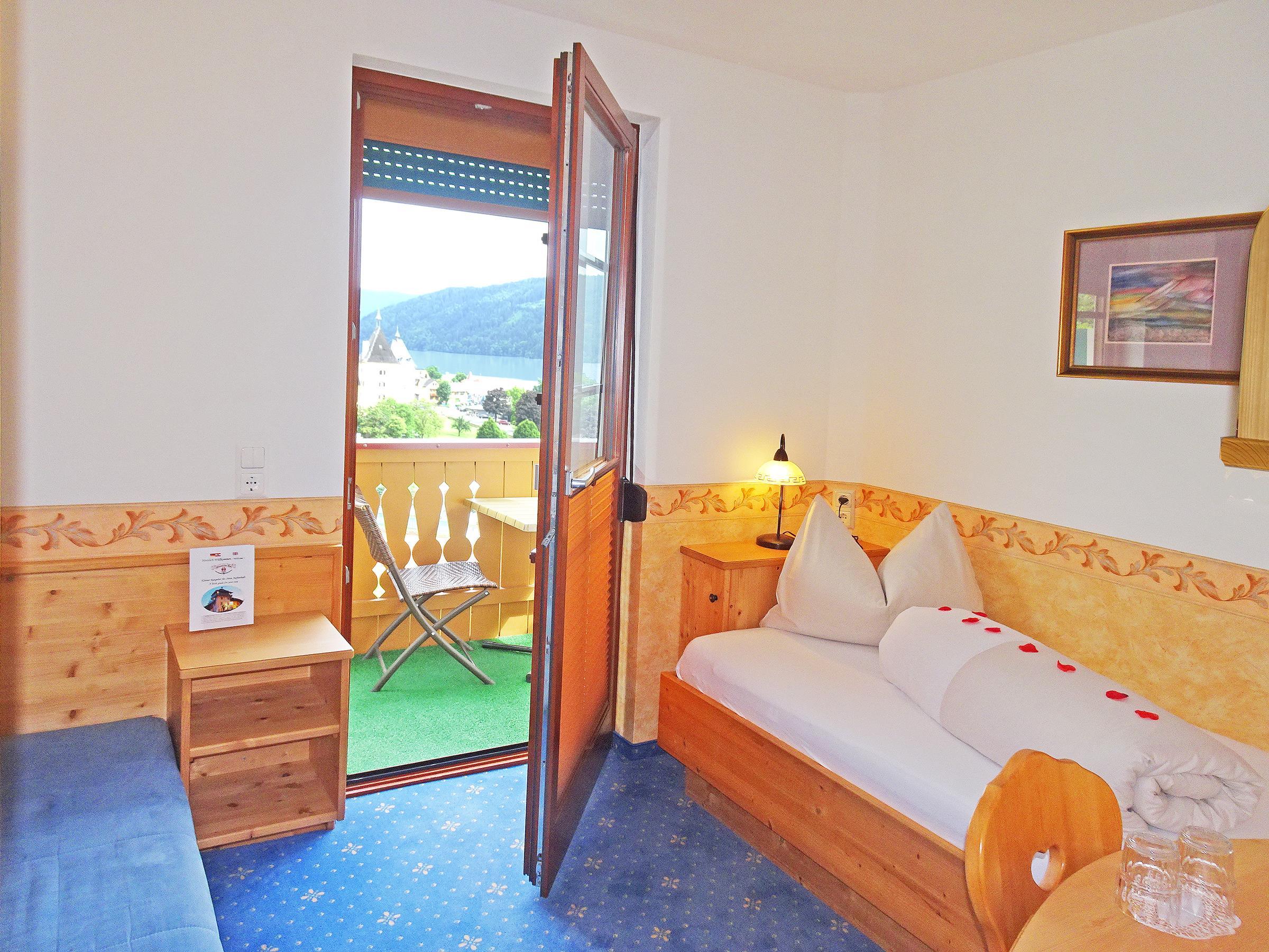Gemütliche und geschmackvoll eingerichtete Einzelzimmer mit DU/WC, SAT-TV, Balkon oder Terrasse mit herrlichem Blick auf den See und die Berglandschaft Oberkärntens. Gepflegter Teppichboden, Vorhänge. Sitzgelegenheit und kleiner Tisch. Verfliestes Bad mit Fön, Hand-/Badetüchern, Seifenspender, Kosmetiktüchern. Balkon / Terrasse mit Sesseln und Tisch. (Aschenbecher für Raucher)Rauchen am Zimmer nicht gestattet. Lage: Erdgeschoss + 2. Obergeschoss, Richtung Süd/West. Heizung. AUF ANFRAGE: Couchbett für zweite Person, Halbpension (nicht in unserem Haus, Partner Restaurant in 500 Metern Entfernung), Haustiere. HINWEIS: Nicht immer stehen alle freien Kontingente online buchbar zur Verfügung. Fragen Sie bei Bedarf bitte an, wir helfen Ihnen gerne weiter.