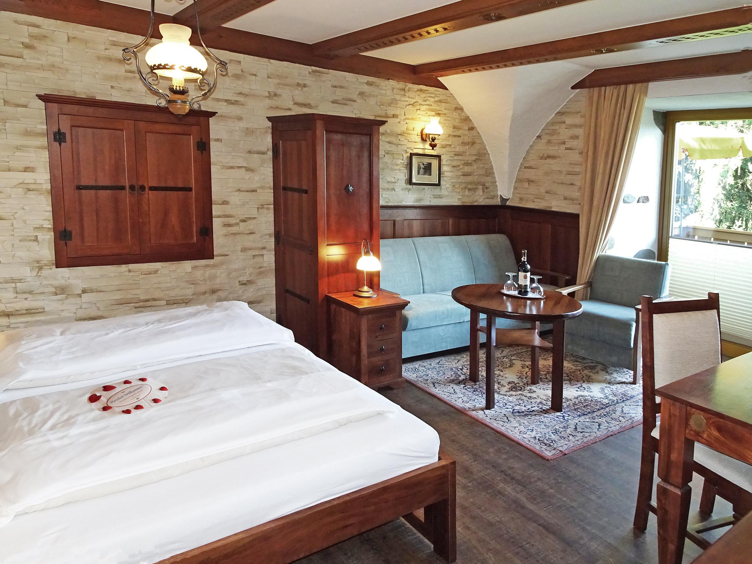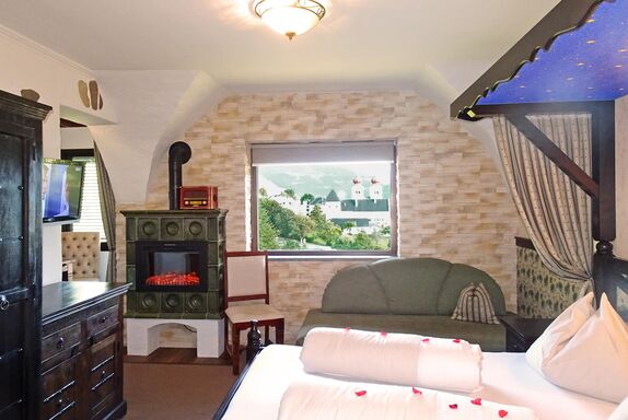 Der Himmel auf Erden - bei uns kein teurer Luxus, sondern die sehr beliebte neue Zimmerkategorie im Haus! Die Einrichtung im Kolonialstil betont den urigen Charakter des alten Ritterhofes. Das Herz des Zimmers bildet selbstverständlich das massive Himmelbett mit Sternenhimmel. Mehr Platz durch eine gemütliche Wohnecke mit romantischem Kaminfeuer (elektrisch) und Mini Kühlschrank (Gesamtfläche ca. 22 m²). Genießen Sie den herrlichen Ausblick von Loggia/Balkon auf See, Berge und das malerische Millstätter Kloster!