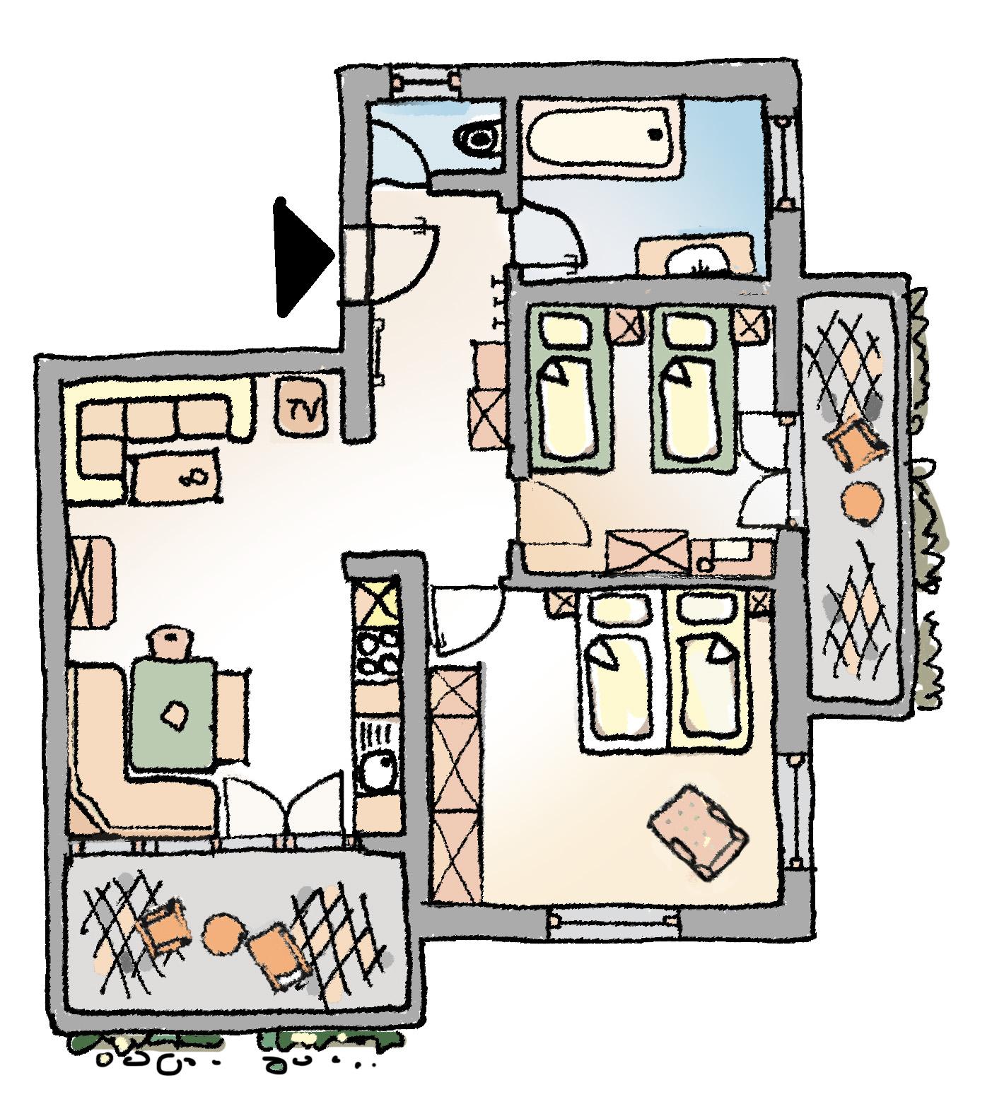 Vitalität, Ausgeglichenheit und Lebensfreude. Das was ein schöner Sonnentag ausmacht gibt es auch in unserer Lärchenwohnung. Die Wohnung bietet ein Elternschlafzimmer mit 2 (3) Betten und ein Kinderschlafzimmer mit 3 Betten. Auch hier sind Bad und Küche dabei.Hier kann man barrierefrei wohnen mit herrlicher Aussicht auf Bad Kleinkirchheim.