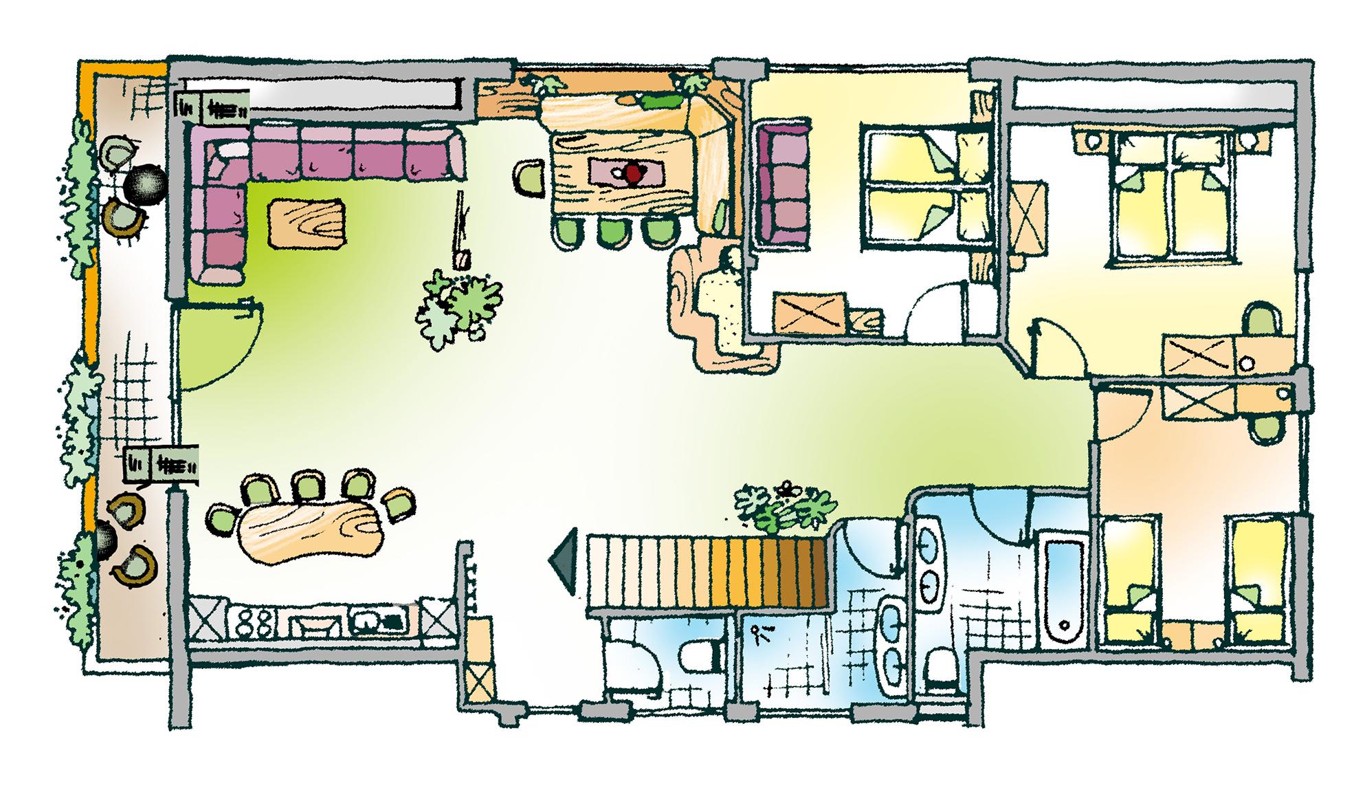 3 Getrennte Schlafräume, 2 getrennte Bäder und getrenntes WC, sowie einen exklusiven Wohnraum mit Sitzecke und Esstisch XL.