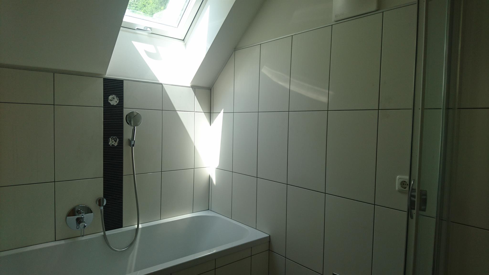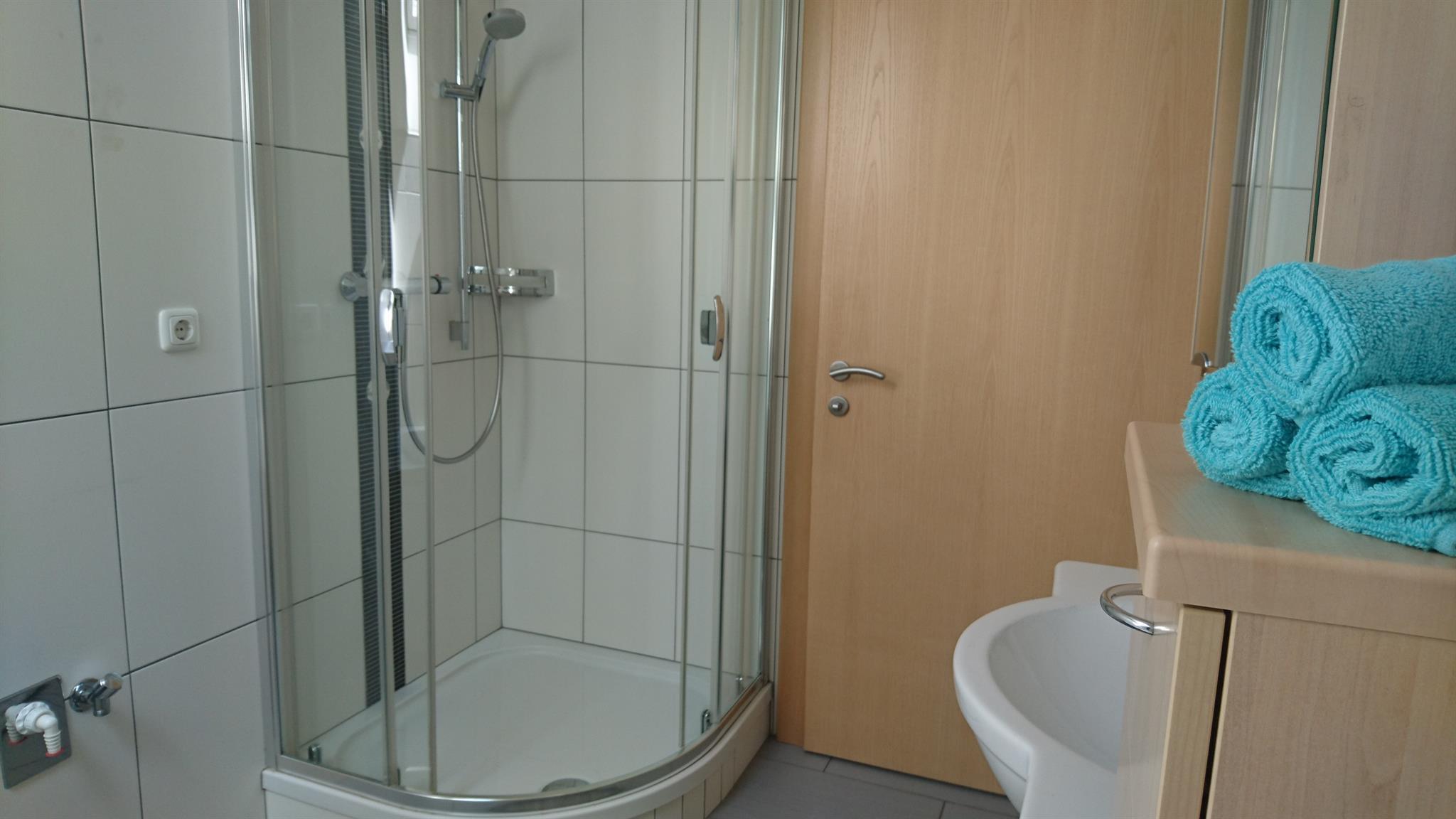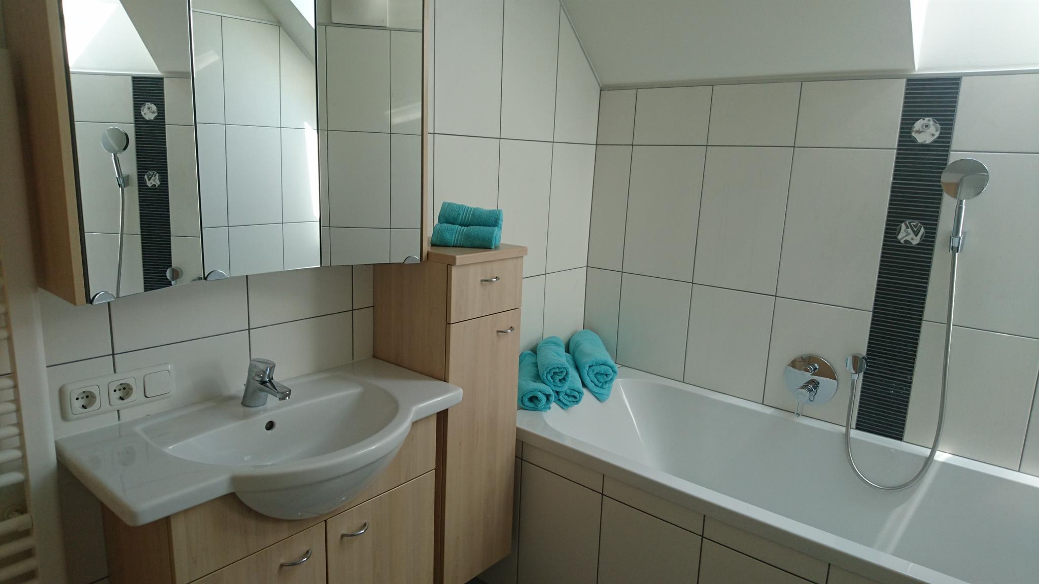 • Badezimmer mit Dusche und Badewanne (Handtücher)