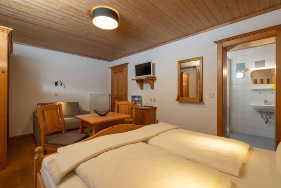 Unsere Einzelzimmer und auch Doppelzimmer sind mit Vollholzmöbel und großteils mit Balkon ausgestattet. In allen Zimmern befindet sich eine Dusche mit WC, ein Flat TV mit SAT und ein Kühlschrank. Ein besonderes Zuckerl bieten die extra breiten Betten in unseren Einzelzimmern. W-LAN steht im ganzen Haus kostenlos zur Verfügung.