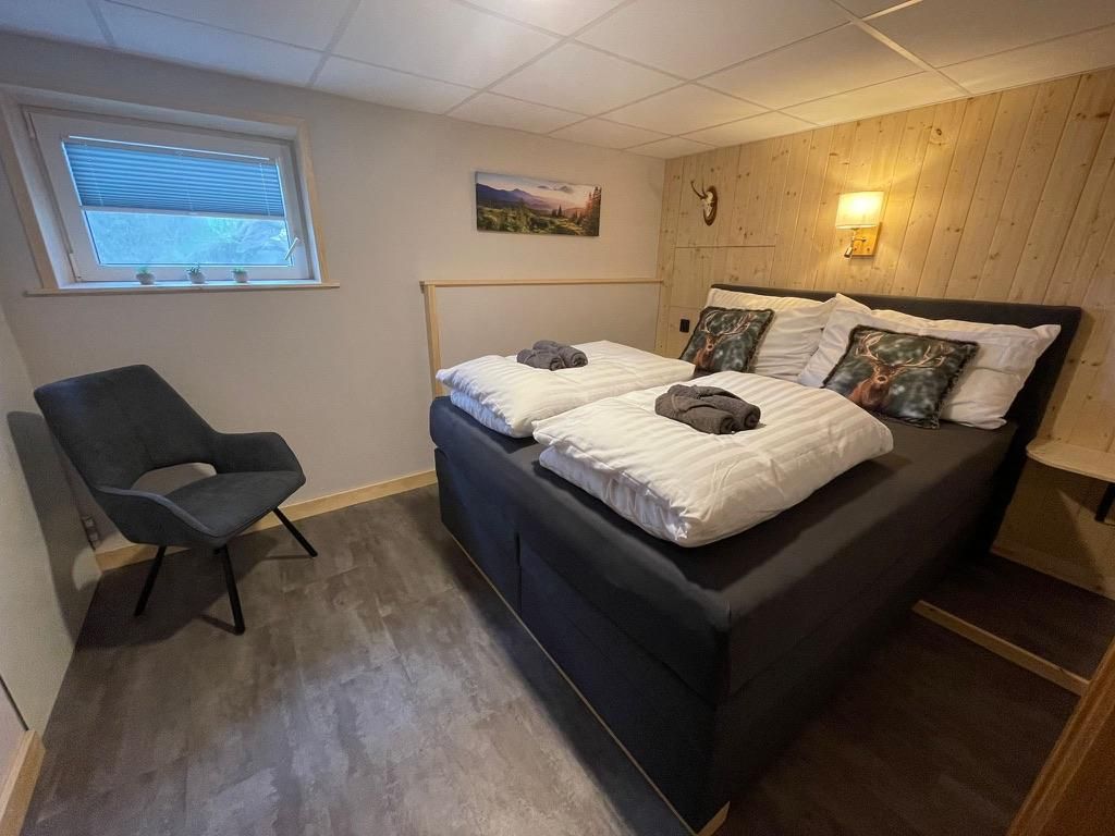 Schlafzimmer; im Schlafzimmer finden Sie ein Queen Size Boxspringbett (1,60 Meter breit). Im Wohnzimmer gibt es ein Schlafsofa (1,40 Meter breit) für 2 zusätzliche Schlafplätze. Bettwäsche ist inklusive.