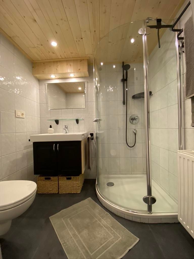 Badezimmer; das Badezimmer verfügt über eine Duschkabine, ein Waschbecken, einen Haartrockner und eine Toilette. Badetücher sind inklusive.