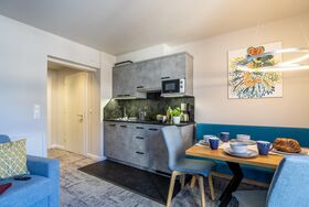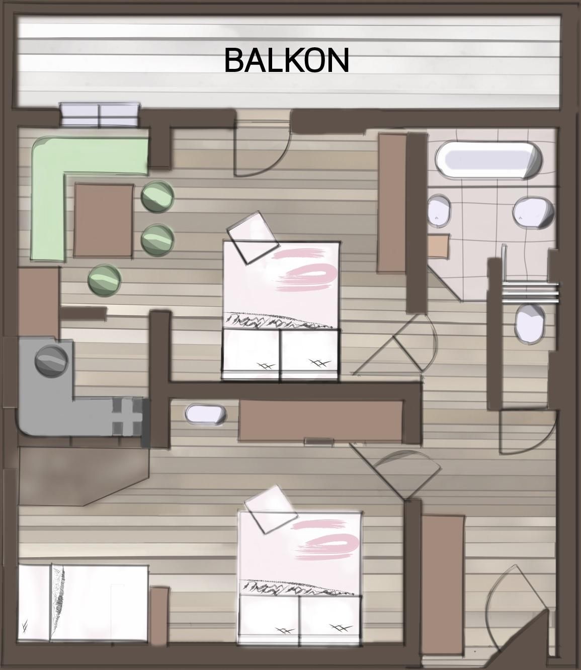 mit zwei getrennten Räumen, ein Wohnzimmer mit Schlafcouch und ein Schlafzimmer, Dusche, WC, Sat-TV, Radio, Telefon, Fön, Balkon, Kochnische mit Essecke STORNO: bis 1 Monat vor Anreise GRATIS 1 Monat bis 1 Woche vor Anreise 70% vom Buchungspreis letzte Woche vor Anreise 90% vom Buchungspreis