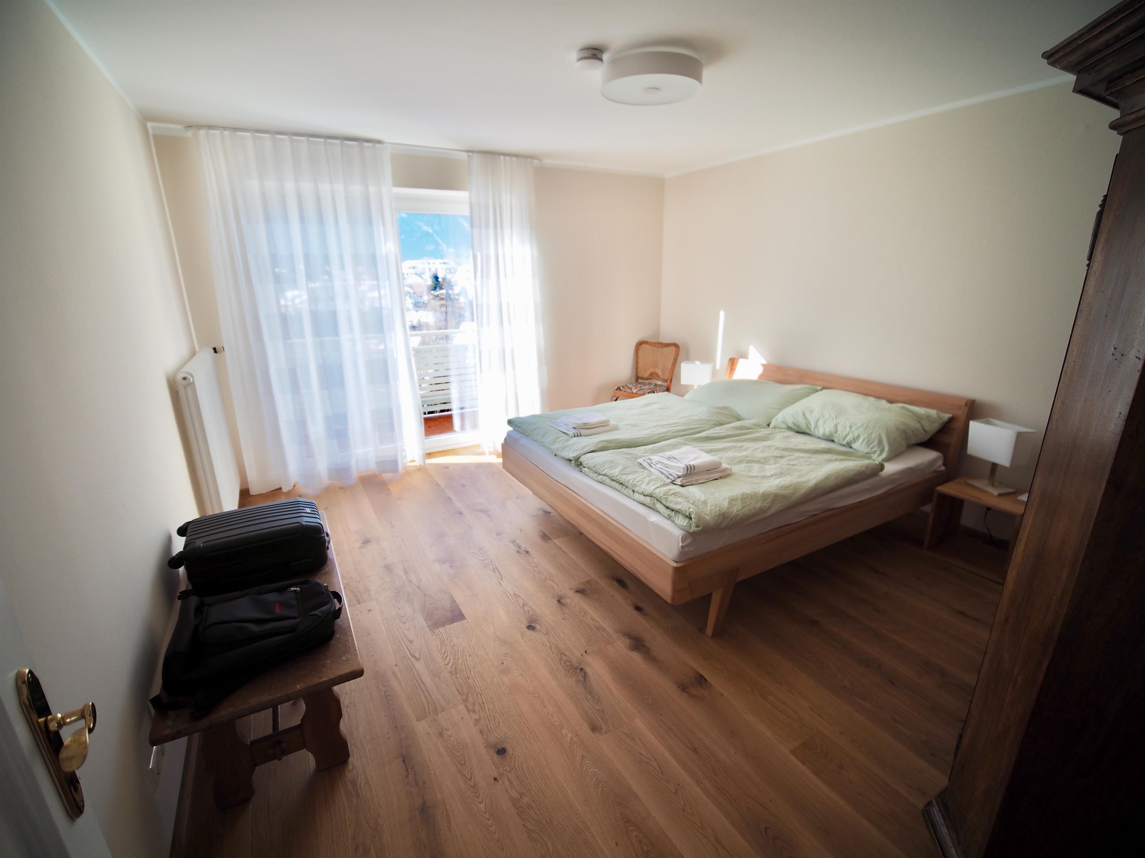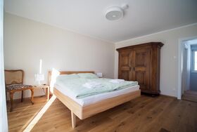 Unser Haus bietet nach dem Umbau bis zu 10 Gästen in fünf Schlafzimmern Platz. Vier Schlafzimmer sind im oberen Stockwerk, eines im Erdgeschoß. Neben den drei grossen Schlafzimmern an der Südseite (23, 17 und 18 m²) mit Doppelbetten (180x200cm), gibt es in beiden Etagen ein kleineres Schlafzimmer (10 m²) mit jeweils einem 140cm breiten Bett.