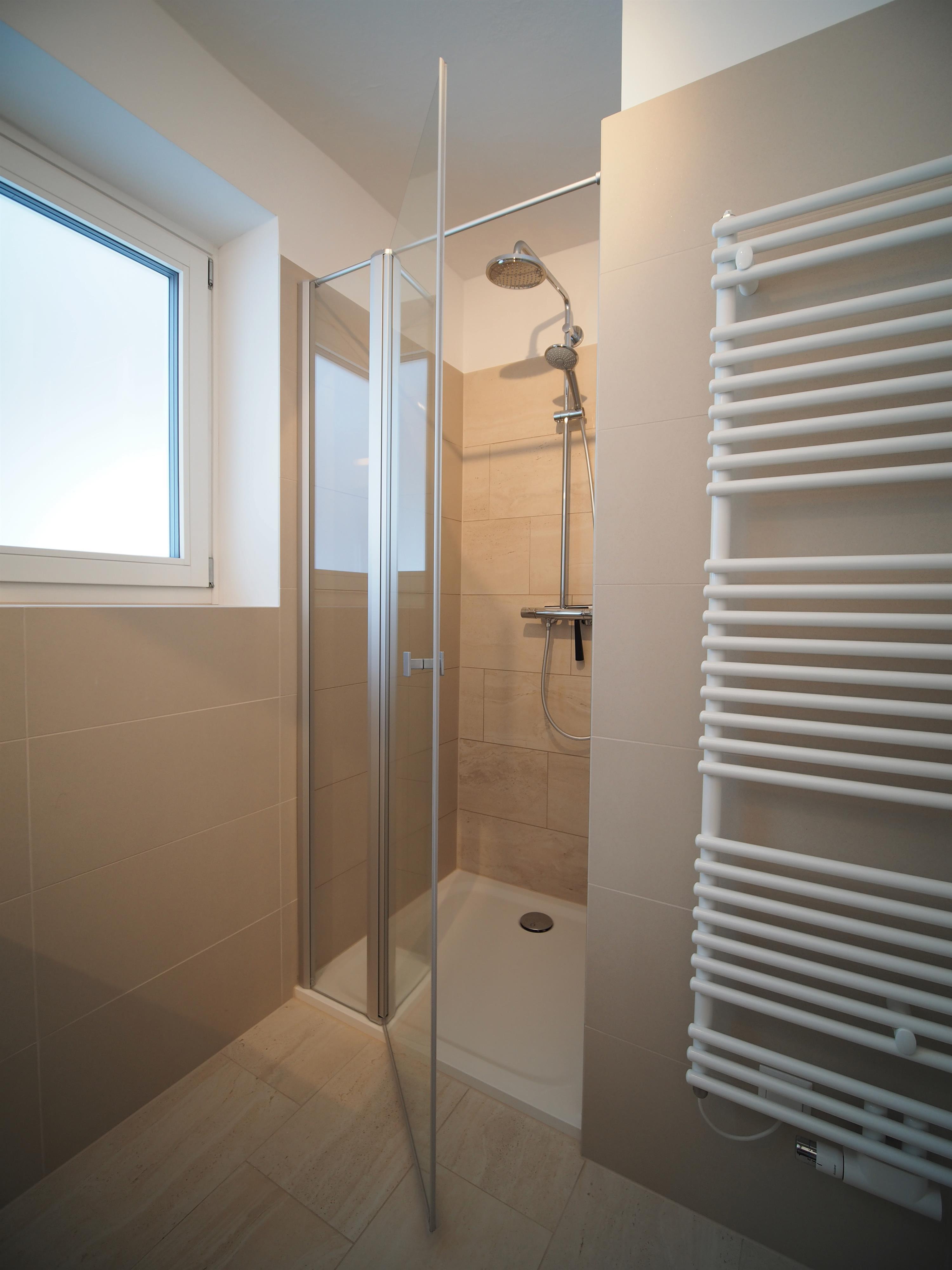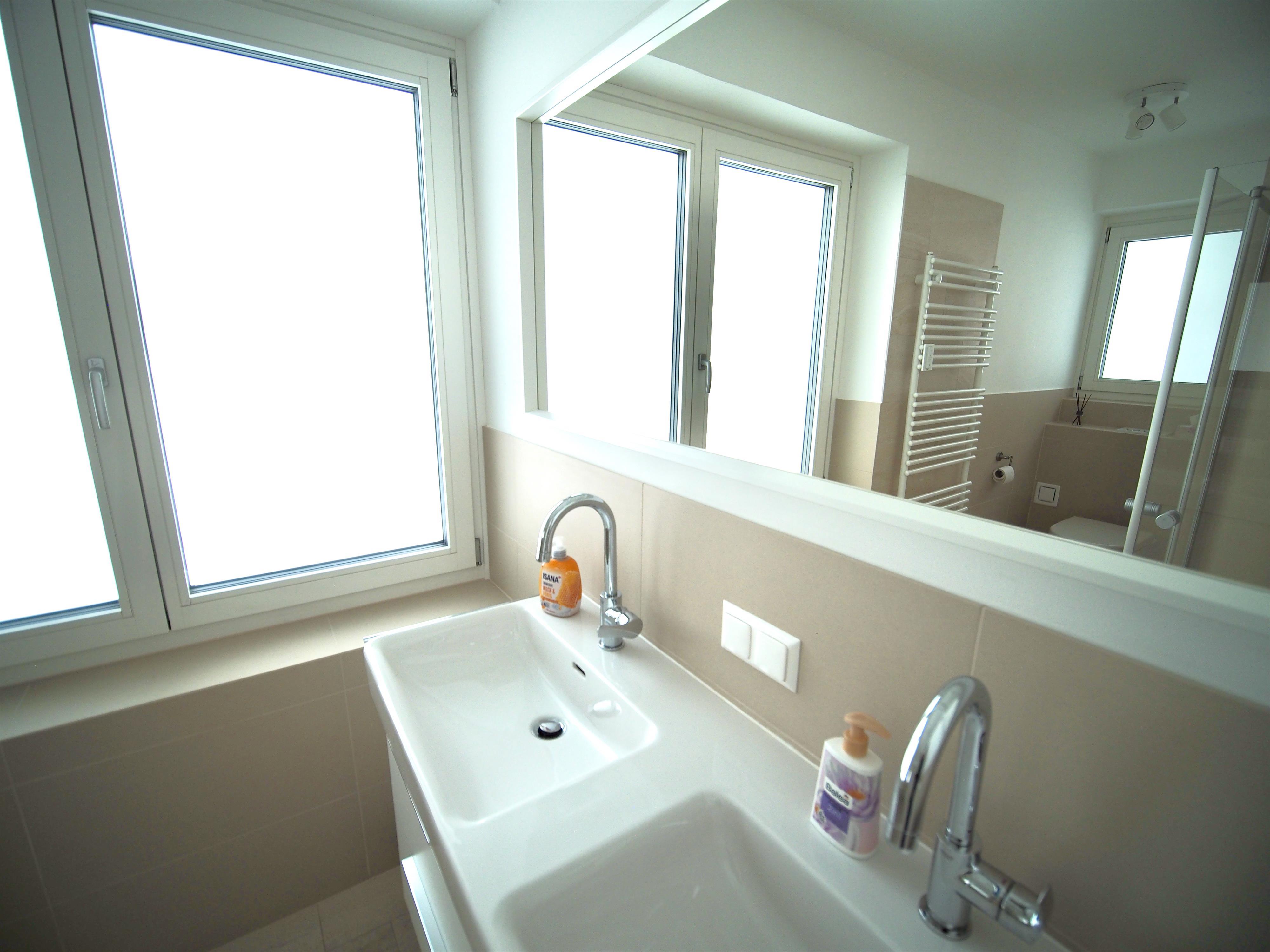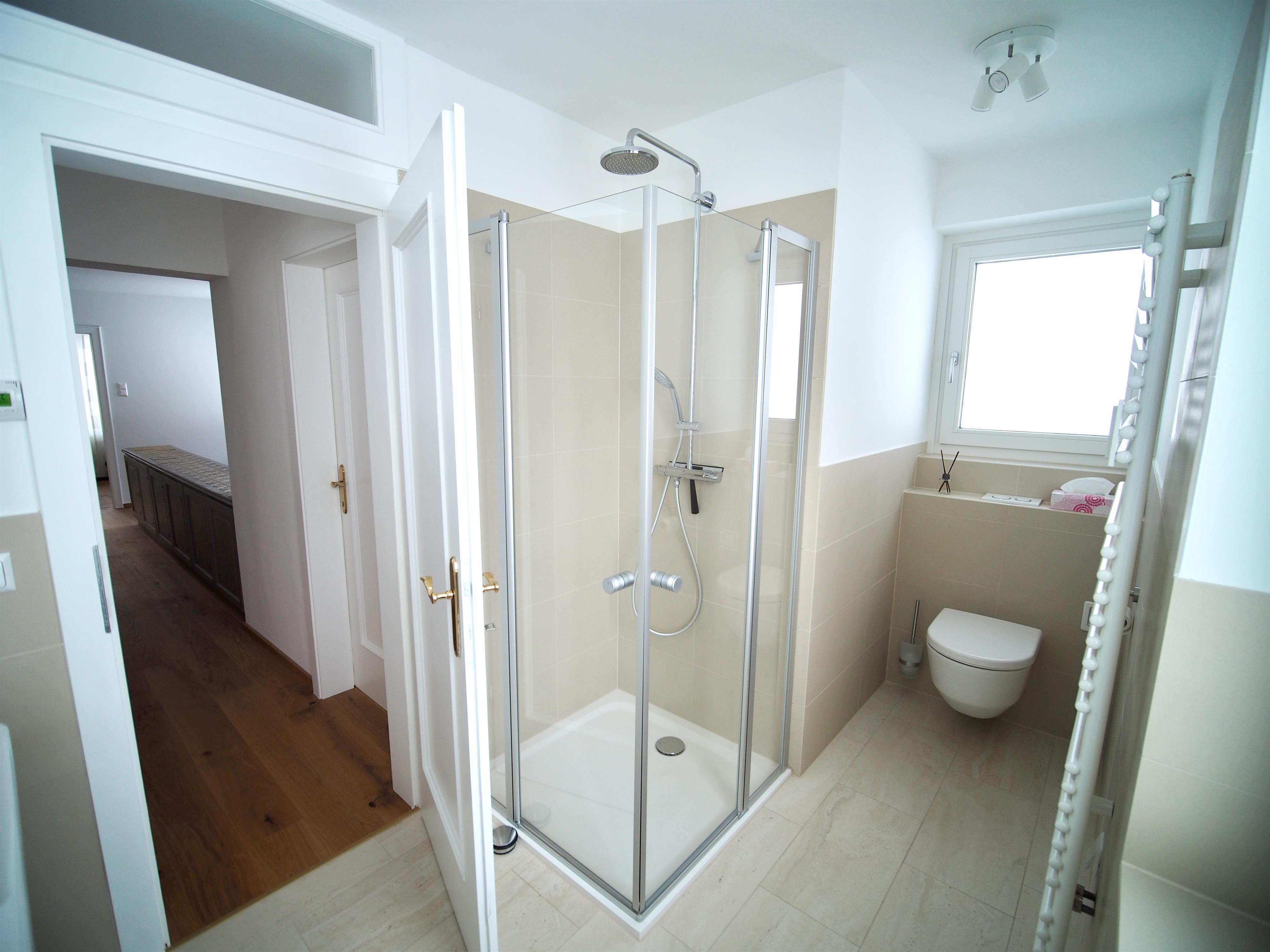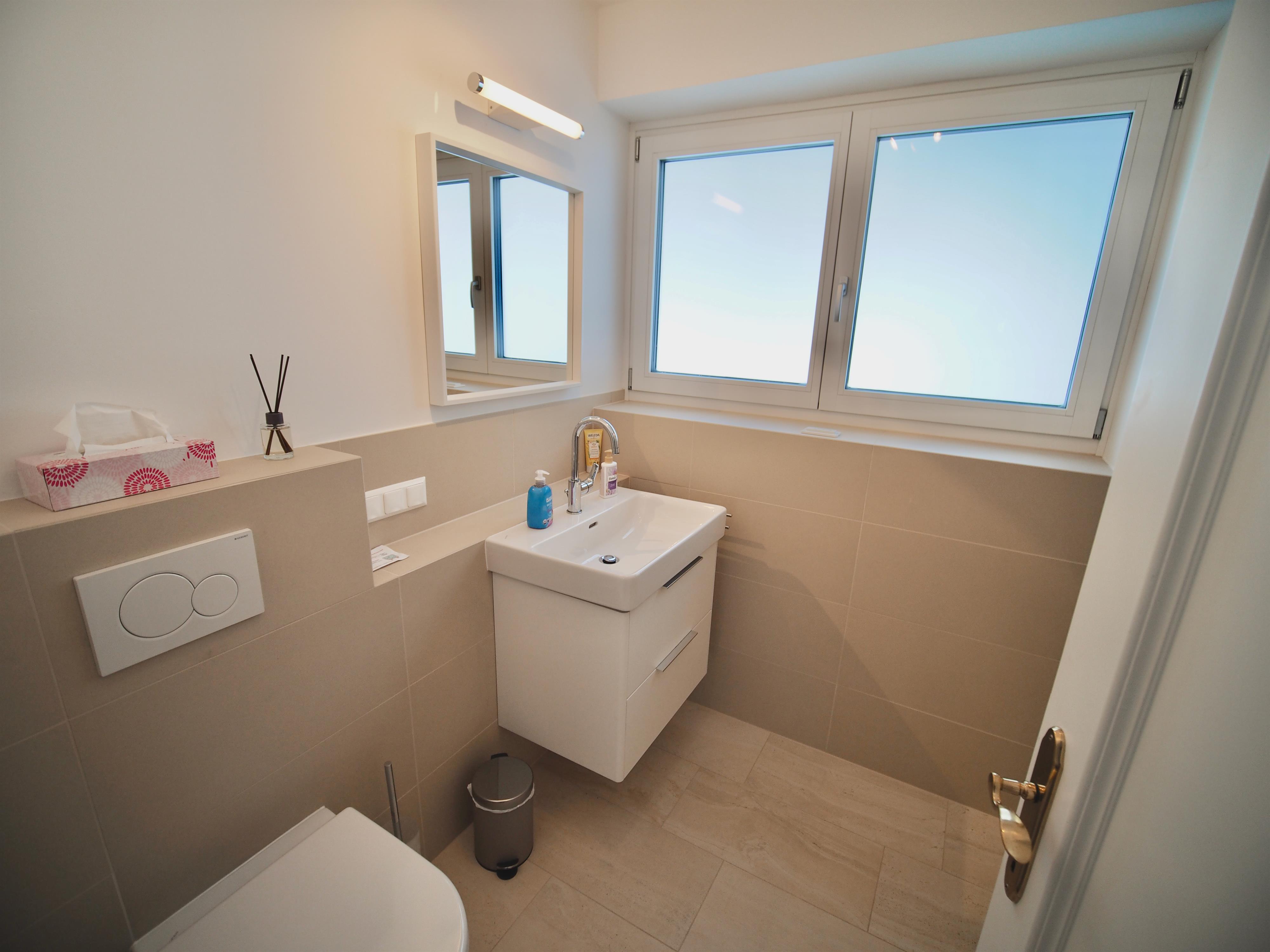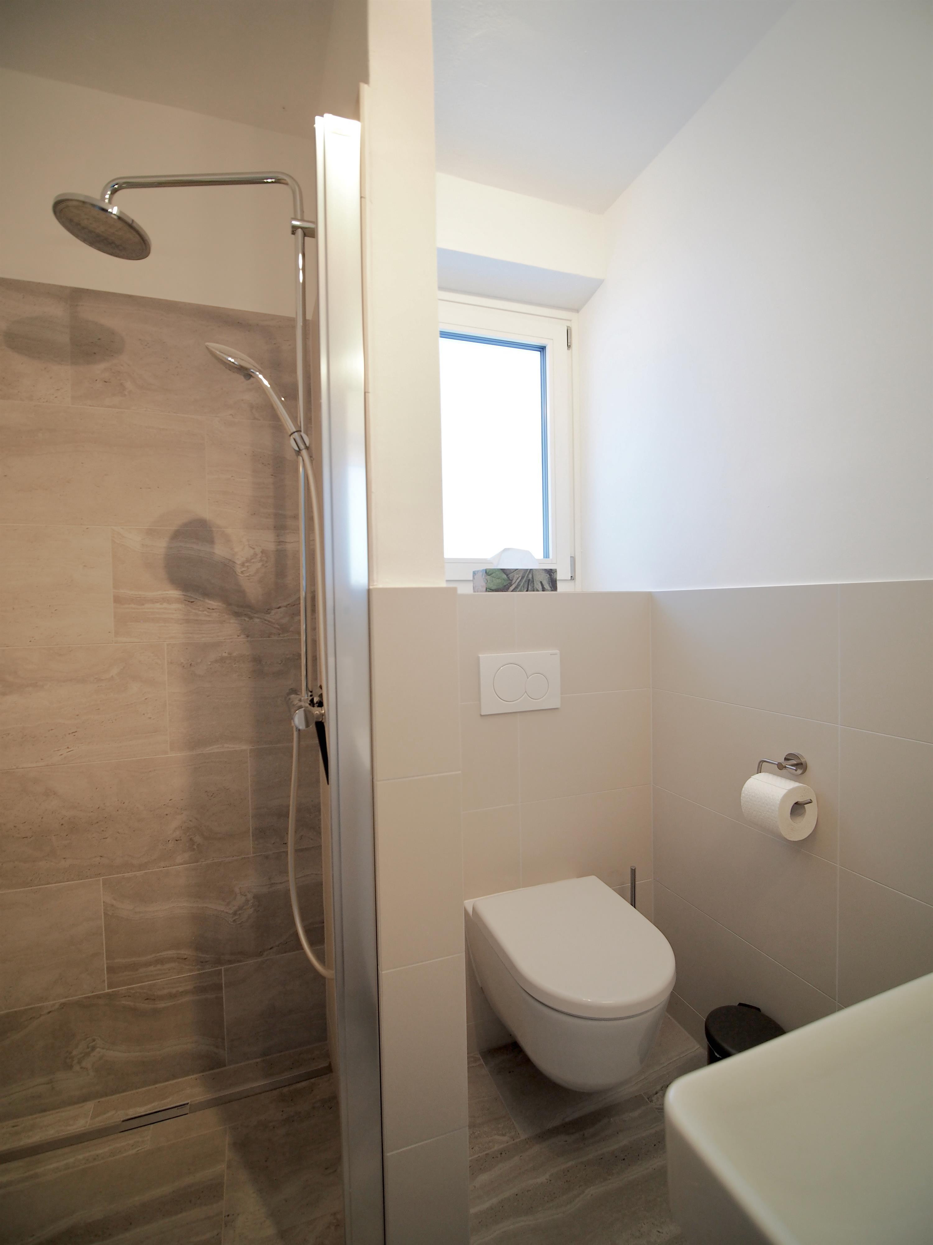 Insgesamt stehen drei Duschbäder mit WC zur Verfügung, im oberen Stockwerk zwei und im unteren Stockwerk ein weiteres. Die Küche bietet ausreichend Möglichkeit für zehn Personen zu kochen. Ein extra großes Induktionskochfeld, ein Backofen mit zahlreichen Sonderfunktionen, ein Mikrowellenherd und ein grosser doppeltüriger Kühlschrank sollten hierbei helfen. Alle Elektrogeräte und die meisten Einrichtungsgegenstände sind bedienungsfreundlich und neu.