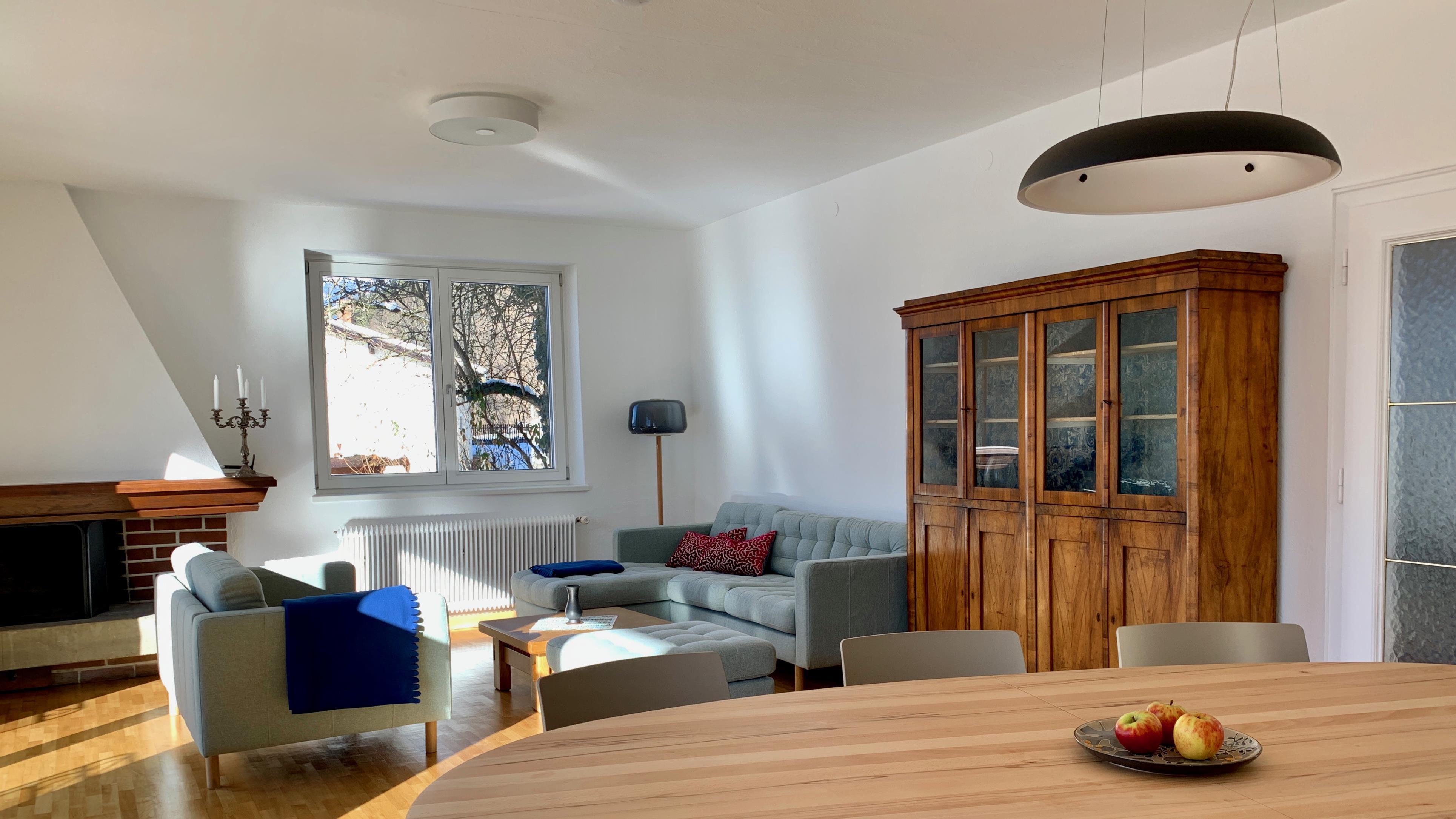 Im Wohnzimmer gibt es einen ausreichend großem Esstisch und eine Couchgarnitur. Bei schönem Wetter können Sie auf der Terrasse sitzen.