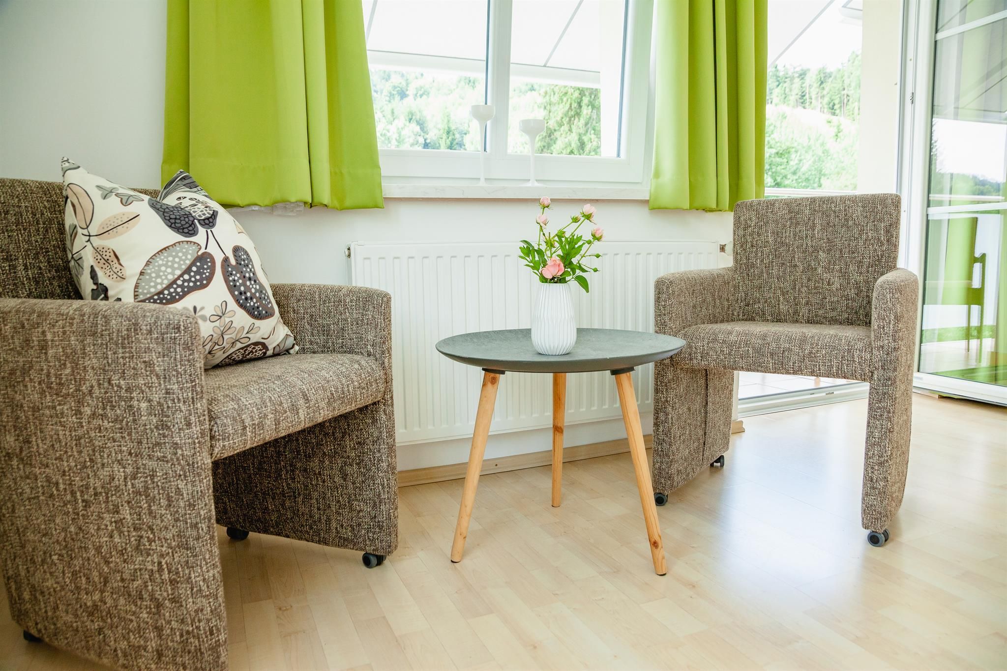 * Wohn-Esszimmer (mit Essecke, bequemer Couch, Flatscreen-Sat-TV und Radio)