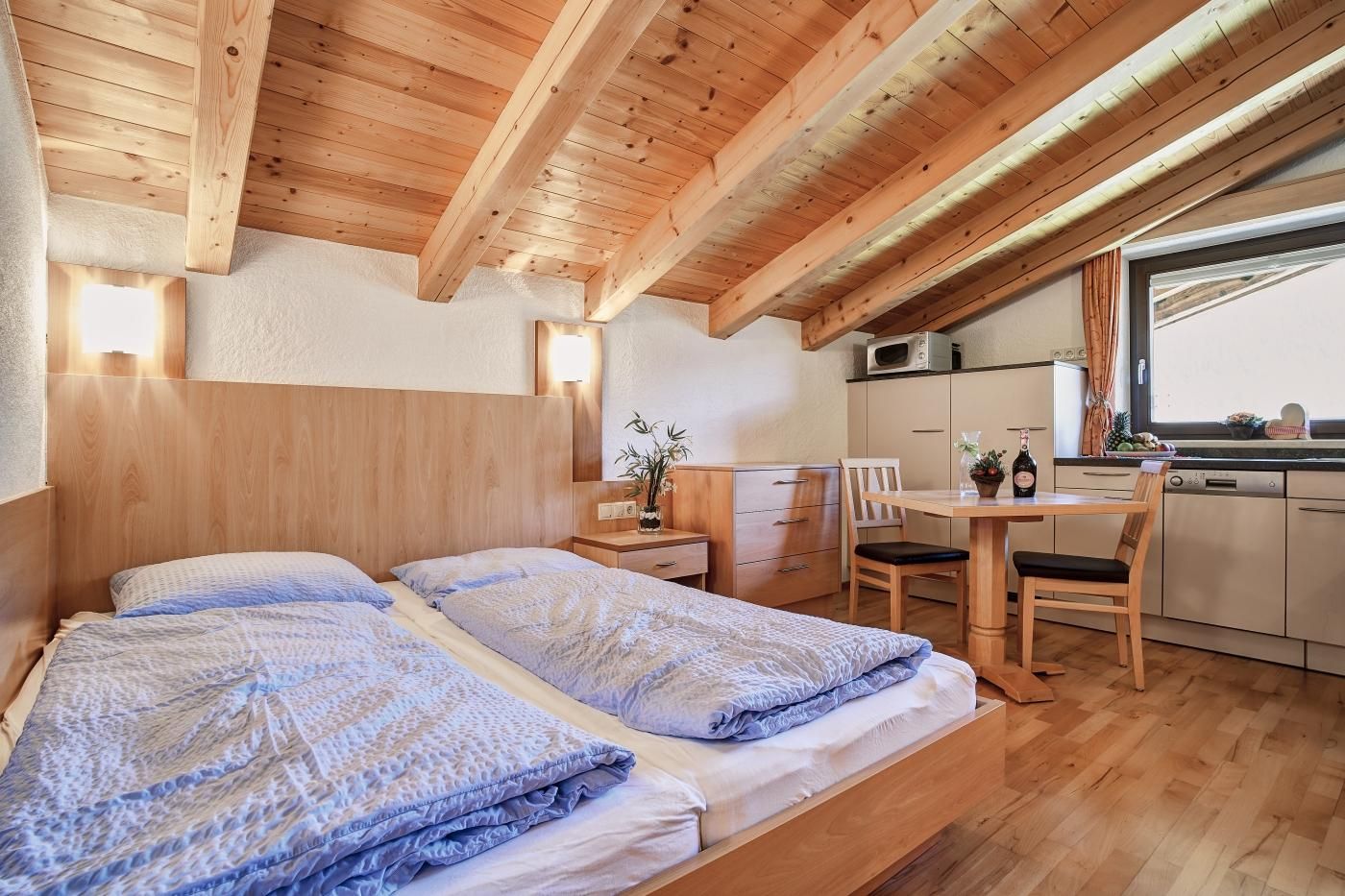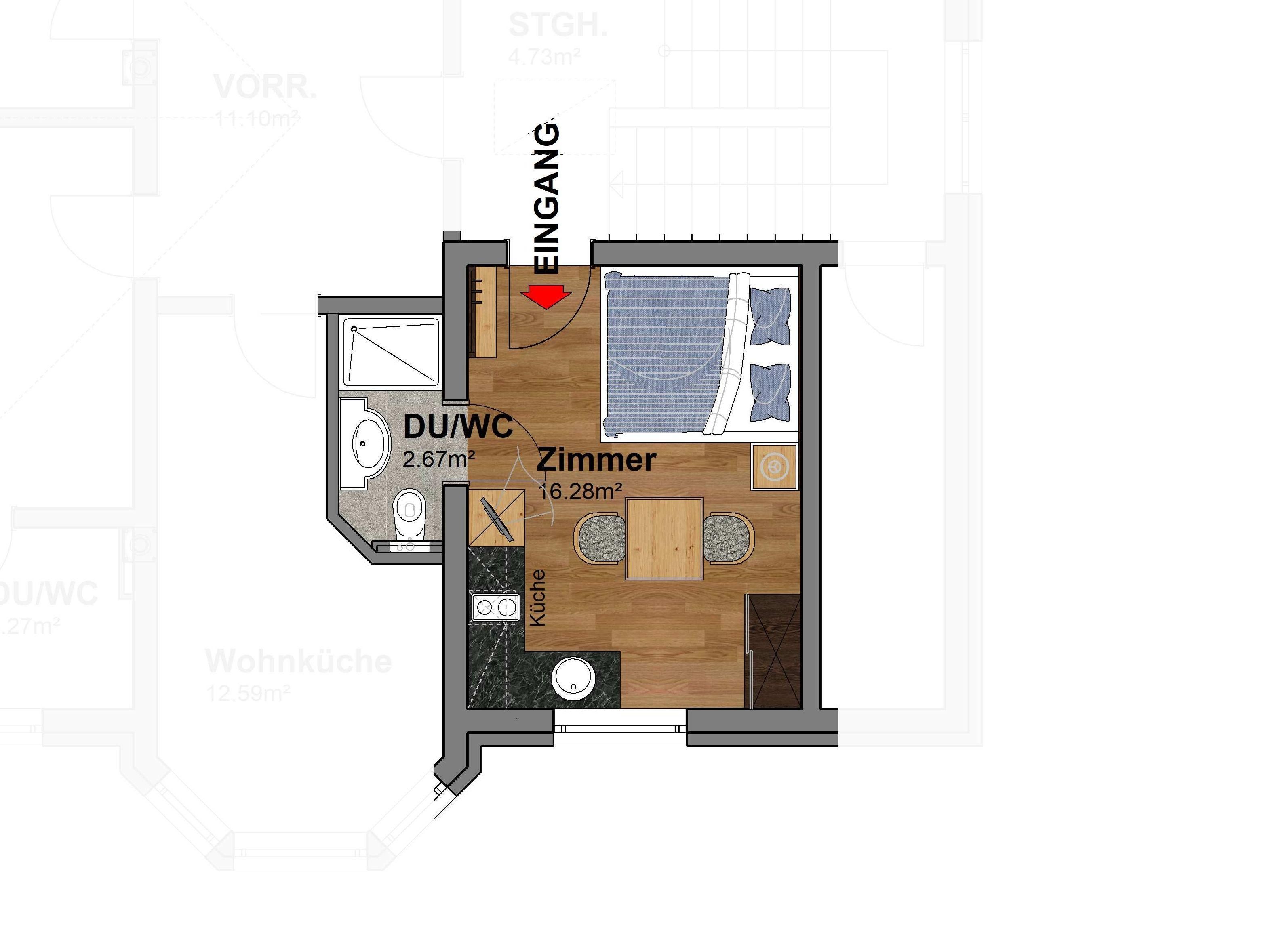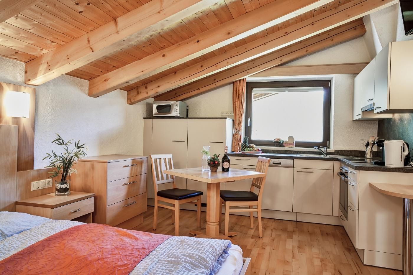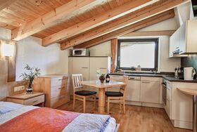 Studio mit ca. 22 m²: Einraum-Appartement mit mit einem Wohn-Schlafraum mit Doppelbett, Küchenzeile (Herd, Kühlschrank, Kaffeemaschiene....), Esstisch und einem durch eine Schiebetür getrenntem Badezimmer mit Dusche/WC.