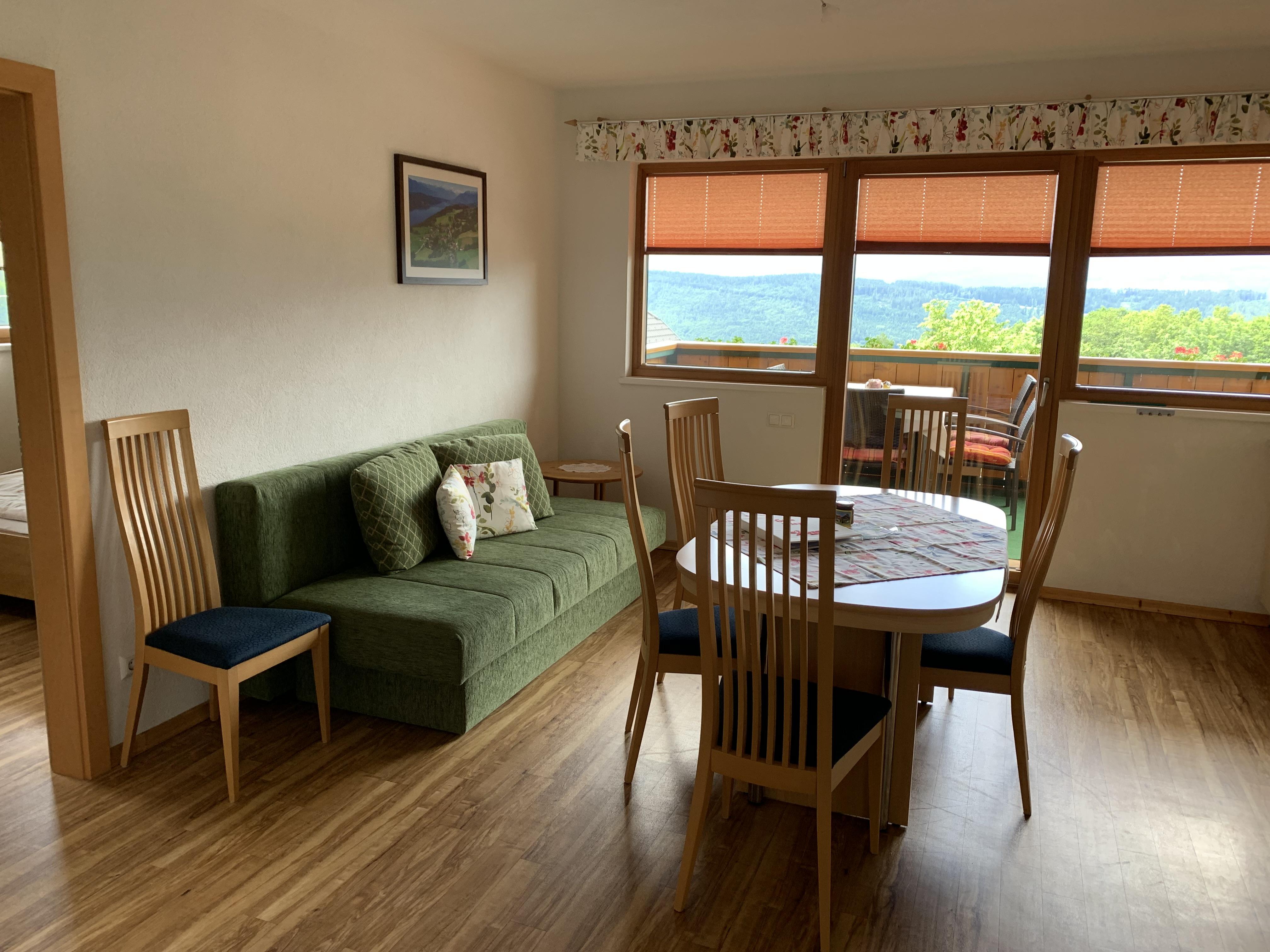 Die gemütliche Ferienwohnung Seeblick befindet sich im 2. Stock des Bauernhauses und bietet Platz für 2-5 Personen. Die Wohnung ist aufgeteilt in zwei getrennte Schlafzimmern. Das erste Doppelzimmer verfügt über ein Doppel- und Einzelbett mit Ostfenster. Das zweite Schlafzimmer ist mit einem Doppelbett ausgestattet und Richtung Westen ausgerichtet.