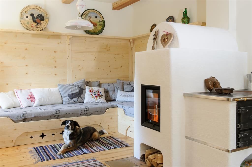 1 Wohn-Esszimmer mit Kachelofen, Zusatzherd, TV, großer Essecke