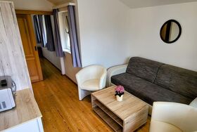 Das Familienzimmer hat ein Wohnzimmer mit Balkon und Seeblick, SAT TV und Kühlschrank, ein Schlafzimmer mit Doppelbett und extra Couch, ein Schlafzimmer mit zwei getrennten Betten, ein neu renoviertes Badezimmer mit Dusche, WC und zwei Waschbecken, Kühlschrank und WLAN. Größe ca 36m².