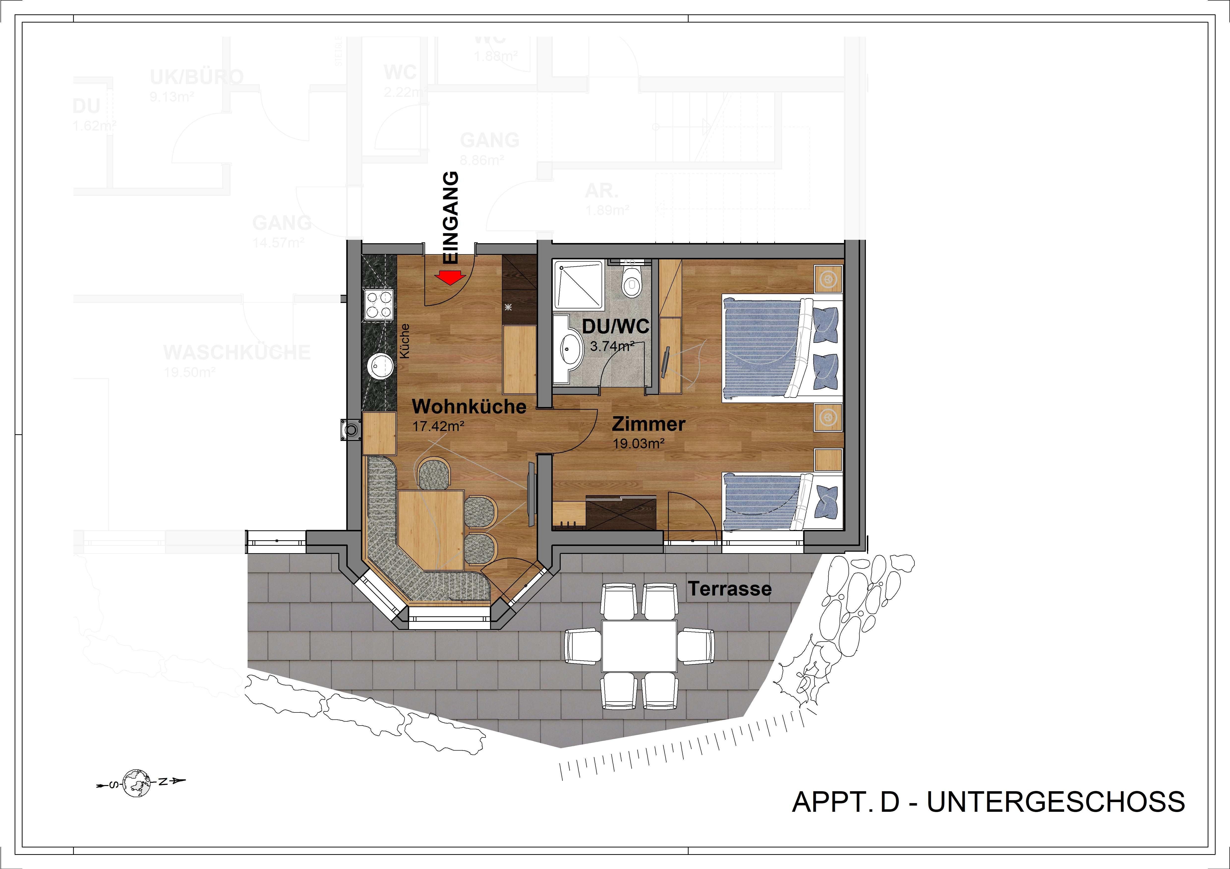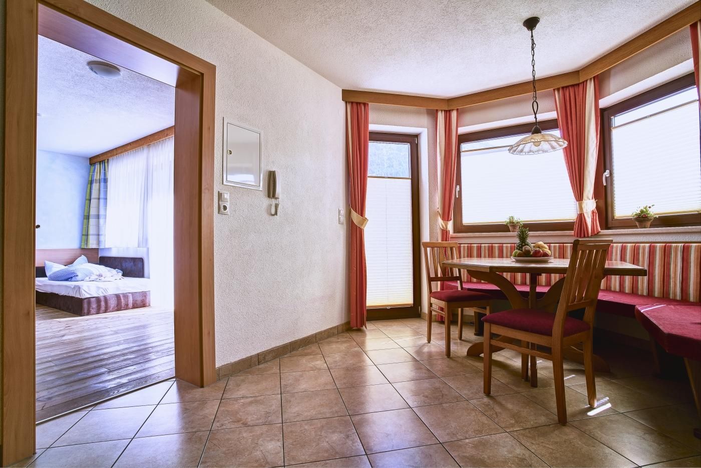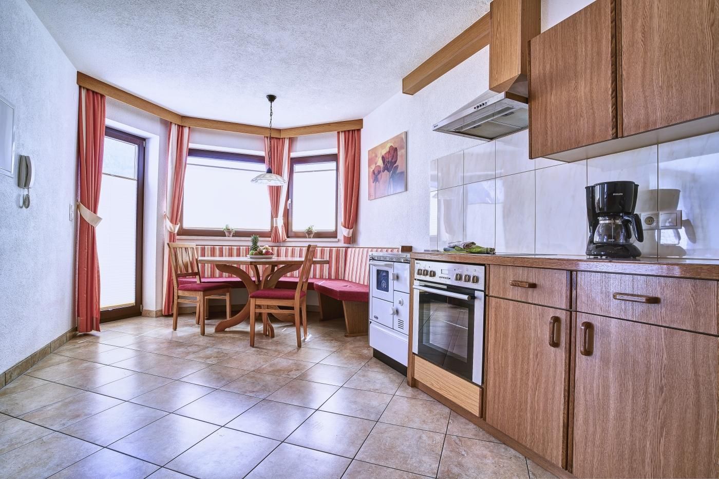 Appartement (ca. 40 m²) mit 1 Doppelzimmer mit Zusatzbett/Schlafsofa für 1 Person, 1 Badezimmer (Dusche/WC), TV, Safe. Wohnküche mit Geschirrspüler, Cerankochfeld, Backrohr, Kühlschrank, Kaffeemaschine, Wasserkocher, Mikrowelle, Essbereich uvm. Die großzügige Terrasse bietet einen herrlichen Ausblick ins Tal.